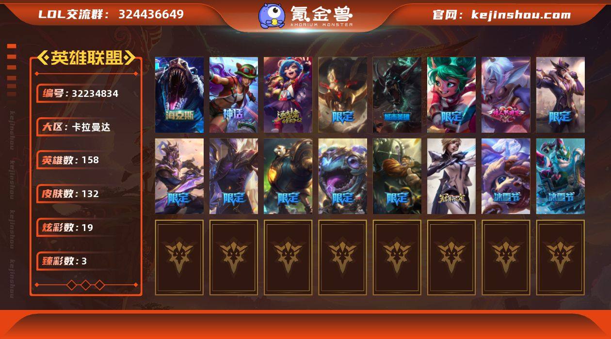 未定级段位-158英雄-132皮肤-19炫彩-0终极-4神话-14限定-20传说-36史诗 【神话皮肤】:十周年纪念安妮,十五周年纪念希维尔,神凰行者瑞羽圣凰艾尼维亚,海克斯科技雷克顿 【臻彩皮肤】:冠军之箭艾希凯旋圣装,咖啡甜心璐璐焦糖布丁,魔女阿卡丽虚荣 【海克斯皮肤】:海克斯科技雷克顿 【情人节限定】:甜心之翎洛 【冰雪限定】:邪恶圣诞老人维迦,冰雪兽纳尔 【限定皮肤】:Fnatic古拉加斯,iG菲奥娜,胜利之剑亚托克斯,胜利机器人布里茨,胜利巨口克格莫,胜利剑圣易,胜利之运崔斯特,南瓜头费德提克,暗影沃里克,波比的巧克力工坊,征服者阿利斯塔 【传说皮肤】:地狱之门卫士加里奥,源计划林易,提莫约德尔人的一大步,欧米伽小队幽灵特工,合金巨兽努努和威朗普,女皇艾希,魔女伊芙琳,源计划泯灭雷克顿,地狱行者孙悟空,神拳李青,银河魔装机神兰博,战斗学院伊泽瑞尔,死亡骑士盖伦,黎明使者锐雯,黯黑魔龙希瓦娜,焰尾妖狐阿狸,灌篮高手德莱厄斯,黑夜使者亚索,神龙尊者昼日真龙亚索,暗星尊烬 【史诗皮肤】:腥红之月崔斯特,铁钩船长费德提克,圣光审判凯尔,侍魂易,战场公主希维尔,火箭达人崔丝塔娜,国王泰达米尔,掠星魔刃卡萨丁,穿着正装的恶魔维迦,抵抗军天使凯特琳,铁血狙击手凯特琳,海贼魅影卡特琳娜,蓝焰梦魔魔腾,V字仇杀者布兰德,防弹武僧李青,至高之拳李青,苍穹之光薇恩,法老王朝内瑟斯,飞车暴走族古拉加斯,兔女郎锐雯,战国大名慎,黑帮教父格雷福斯,皇家守卫菲奥娜,铁血帝皇德莱厄斯,无限烈焰黛安娜,血羽凤凰奎因,萌侦探喵尔摩斯,西部牛仔亚索,源计划风亚索,西部牛仔烬,黯焰双魂千珏,黑帮狂花金克丝,五星大厨塔姆,源计划阴劫,源计划自由艾克,炼狱魔女蔚 【王者皮肤】:霹雳游侠弗拉基米尔,死亡骑士内瑟斯,战地之王加里奥 【勇士皮肤】:创意工坊...