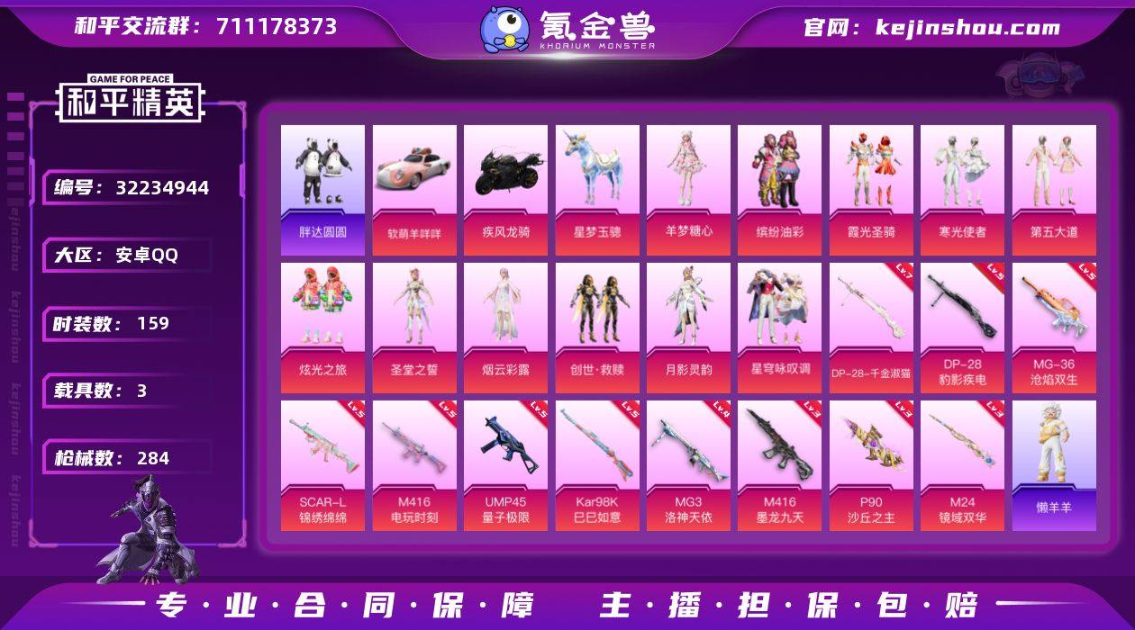 安卓 手Q-13粉装-13特效枪-3载具-9粉色飞行器-90942热力值-14王牌印记-159套装-284枪皮 【热门品类】:粉装-缤纷油彩,套装-胖达圆圆,套装-龟仙人 【粉色套装】:粉装-缤纷油彩,粉装-霞光圣骑,粉装-寒光使者,粉装-第五大道,粉装-炫光之旅,角色-圣堂之誓,角色-烟云彩露,套装-创世·救赎,角色-月影灵韵,粉装-星穹咏叹调,角色-羊梦糖心,角色-月中灵 【粉色枪皮等级】:SCAR-L-锦绣绵绵(五级),M416-电玩时刻(五级),M416-墨龙九天(三级),ACE32-萌骑漫游(五级),UMP45-量子极限(五级),P90-沙丘之主(三级),Kar98K-巳巳如意(五级),M24-镜域双华(三级),Mk14-福马献瑞(五级),DP-28-千金淑猫(七级),DP-28-豹影疾电(五级),MG3-洛神天依(四级),MG-36-沧焰双生(五级) 【粉色载具】:软萌羊咩咩,疾风龙骑,星梦玉骢 【粉色枪皮】:SCAR-L-锦绣绵绵,M416-电玩时刻,M416-墨龙九天,ACE32-萌骑漫游,UMP45-量子极限,P90-沙丘之主,Kar98K-巳巳如意,M24-镜域双华,Mk14-福马献瑞,DP-28-千金淑猫,DP-28-豹影疾电,MG3-洛神天依,MG-36-沧焰双生 【粉色飞行器】:炫彩糖果飞行器,祥瑞起舞飞行器,沙丘之主天马,镜域双华-灵镜之阶,龙翔九天飞行器,彩虹独角兽飞行器,终晖之翼飞行器 【粉色降落伞】:洛神天依降落伞,圣光天使降落伞,音爆索尼克降落伞,萌物绒绒降落伞,炫光之旅降落伞,萌酷奶龙降落伞,圣堂之誓降落伞,夜幕颂歌降落伞,沙丘之主降落伞,繁龙极客降落伞,蜜语绒猫降落伞,江南烟雨降落伞,霓虹漫游降落伞,精灵梦叶罗丽降落伞,墨龙九天降落伞,守护天翼降落伞,忍者神龟降落伞,BEARBRICK降落伞,幽焰骑士降落伞,千金淑猫降落伞,动力核心降落伞,幻彩电音降落伞,绯穹魔姬降落伞,喜羊羊与灰太狼降落伞,炫彩糖果降落伞,灵驹仙姬降落伞 【稀有套装】:套装-龟仙人,套装-巳巳如...