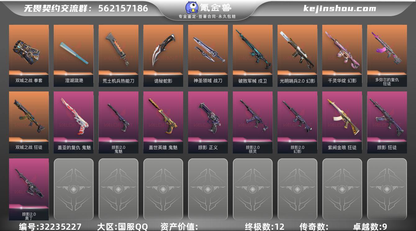【套装】:《双城之战》收藏套装,掠影//2.0套装 【英雄】:幻棱,炼狱,维斯,暮蝶,钛狐,壹决,铁臂,捷风,雷兹,幽影,不死鸟,贤者,猎枭,蝰蛇,零,芮娜,奇乐,尚勃勒,霓虹,斯凯,夜露,星礈,K/O,海神,盖可,黑梦,钢锁 【近战武器】:近战武器-影钩,近战武器-威龙之刃,近战武器-澄湖潋滟,近战武器-双城之战 拳套,近战武器-荒土机兵 热能刀,近战武器-诡秘蛇影 军刀,近战武器-神圣领域 战刀 【狂徒】:狂徒-双城之战,狂徒-多弥尔的复仇,狂徒-掠影,狂徒-紫阙金琅,狂徒-荒土机兵,狂徒-诡秘蛇影 【幻影】:幻影-光明哨兵//2.0,幻影-千灵华绽,幻影-掠影//2.0,幻影-神圣领域,幻影-纳米打击,幻影-末日之翼 【戍卫】:戍卫-破败军械,戍卫-珍珠棘贝,戍卫-逆冲蛮牛,戍卫-月球哨兵,戍卫-折光棱晶 【獠犬】:獠犬-神圣领域,獠犬-逆冲蛮牛 【冥驹】:冥驹-荒土机兵,冥驹-复古浪潮,冥驹-星云暗涌 【飞将】:飞将-末日之翼 【莽侠】:莽侠-诡秘蛇影,莽侠-月球哨兵 【战神】:战神-神圣领域,战神-深海水族 【奥丁】:奥丁-掠影//2.0,奥丁-纳米打击,奥丁-末日之翼 【判官】:判官-诡秘蛇影,判官-纳米打击x 【雄鹿】:雄鹿-复古浪潮,雄鹿-逆冲蛮牛,雄鹿-月球哨兵 【骇灵】:骇灵-掠影//2.0,骇灵-荒土机兵,骇灵-珍珠棘贝,骇灵-星云暗涌 【蜂刺】:蜂刺-深海水族,蜂刺-星云暗涌,蜂刺-折光棱晶 【标配】:标配-超能偶像,标配-荒土机兵,标配-艺高胆大,标配-折光棱晶 【正义】:正义-掠影,正义-纳米打击,正义-月球哨兵 【鬼魅】:鬼魅-盖世英雄,鬼魅-盖亚的复仇,鬼魅-掠影//2.0,鬼魅-诡秘蛇影,鬼魅-灵魂消声者,鬼魅-星云暗涌 【狂怒】:狂怒-珍珠棘贝,狂怒-神圣领域,狂怒-逆冲蛮牛 【短炮】:短炮-深海水族,短炮-末日之翼 【卡面】:终章:激斗汉堡 卡面,进入射程 卡面,...