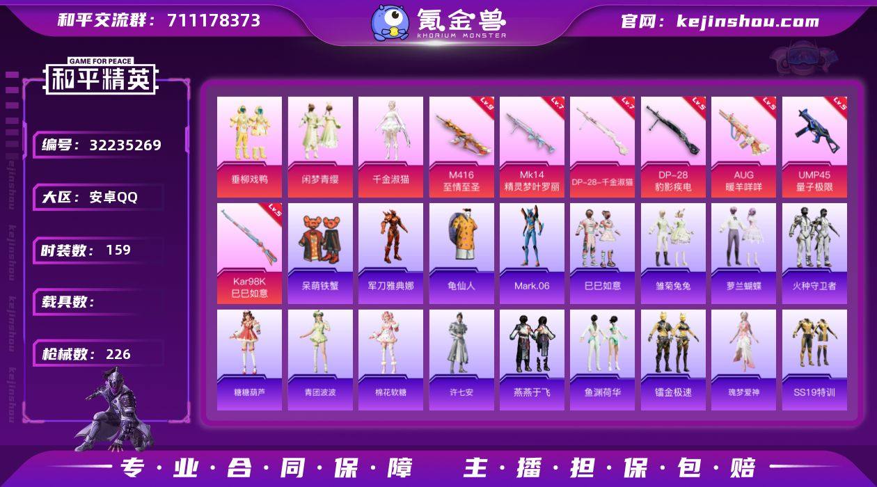 【kyhp1010】安卓 手Q-4粉装-9特效枪-0载具-2粉色飞行器-67791热力值-10王牌印记-159套装-226枪皮 【热门品类】:角色-军刀雅典娜,套装-龟仙人,角色-Mark.06 【粉色套装】:粉装-垂柳戏鸭,粉装-闲梦青缨,角色-千金淑猫,角色-罪夜之冕 【粉色枪皮等级】:M416-至情至圣(九级),AUG-暖羊咩咩(五级),UMP45-量子极限(五级),Kar98K-巳巳如意(五级),Mk14-精灵梦叶罗丽(七级),Mk14-福马献瑞(三级),AA12-G-萌骑幻想(四级),DP-28-千金淑猫(七级),DP-28-豹影疾电(五级) 【粉色枪皮】:M416-至情至圣,AUG-暖羊咩咩,UMP45-量子极限,Kar98K-巳巳如意,Mk14-精灵梦叶罗丽,Mk14-福马献瑞,AA12-G-萌骑幻想,DP-28-千金淑猫,DP-28-豹影疾电 【粉色飞行器】:炫彩糖果飞行器 【粉色降落伞】:绝对恒星降落伞,极限特训降落伞,环太平洋降落伞,垂柳戏鸭降落伞,太空嘟嘟降落伞,旋转彩虹降落伞,第五大道降落伞,未来歌姬降落伞,江南烟雨降落伞,精灵梦叶罗丽降落伞,创世·救赎降落伞,忍者神龟降落伞,未来领航者降落伞,千金淑猫降落伞,极意拳锋降落伞,炫彩糖果降落伞,虎痴许褚降落伞 【稀有套装】:套装-龟仙人,套装-巳巳如意,套装-雪国风尚,套装-炫彩糖果,套装-马上有钱,套装-雏菊兔兔,套装-萝兰蝴蝶,套装-火种守卫者,套装-糖糖葫芦,套装-青团波波,套装-棉花软糖,角色-许七安,套装-燕燕于飞,套装-鱼渊荷华,套装-镭金极速,角色-瑰梦爱神 【稀有枪皮】:AUG-冰晶雪宝,AKM-彩虹符号,AKM-环太平洋,AKM-缤纷海域,AKM-霓虹街区,AKM-龙的传人,M16A4-幻世战舞者,M16A4-甜心亚梦,M16A4-蓝色火焰,M16A4-千金淑猫,SCAR-L-夜灯,SCAR-L-炫彩节奏,SCAR-L-玉兔迎春,M416-暗夜行者,M416-糯团青竹,M416-红色方程式,M416-绯红前夜,M416-蓝色火焰,GROZA-田园牧歌,AUG-天降萌叽,AUG-海螺星...