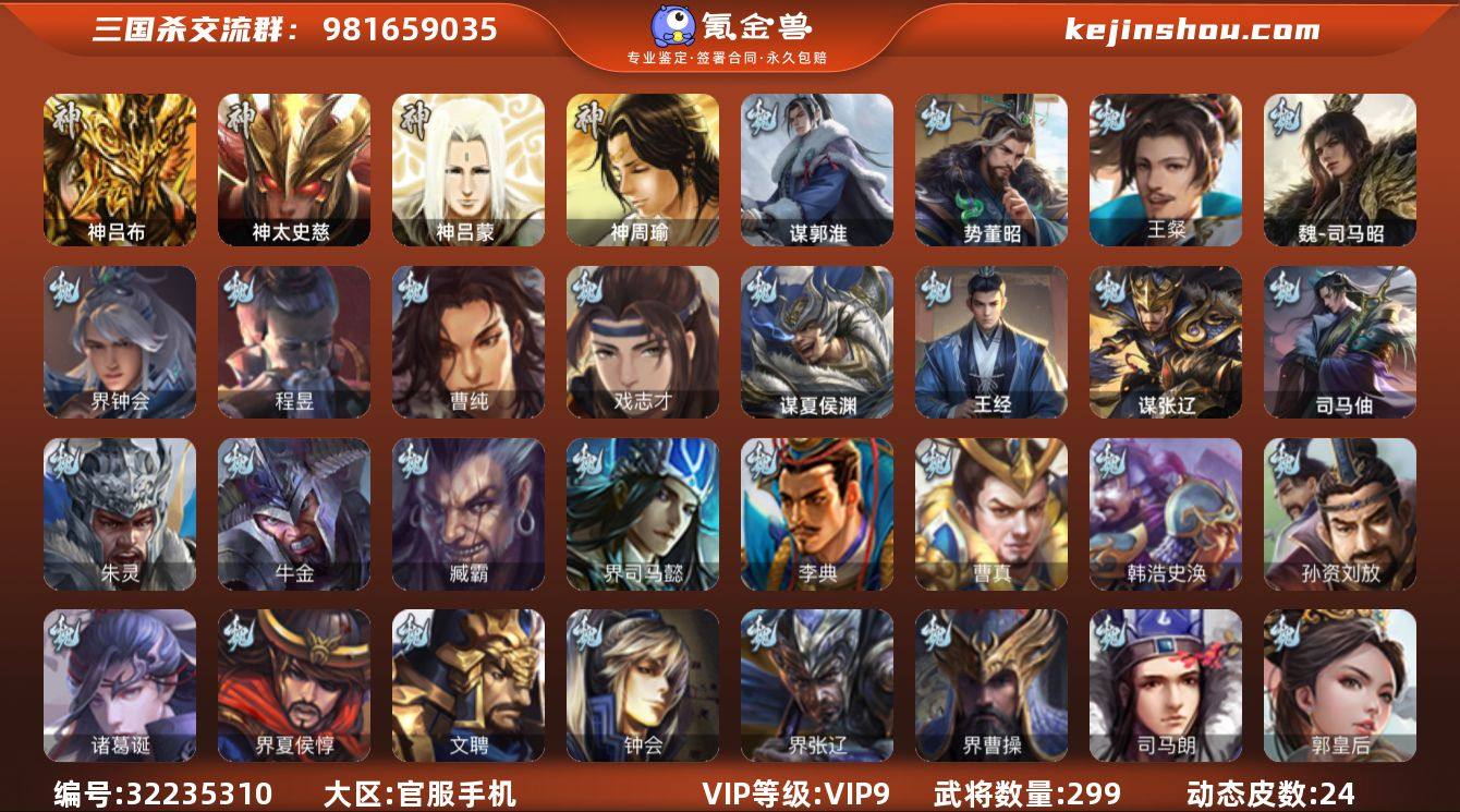 VIP等级: VIP9 官阶: 骠骑将军 武将数量: 299 动态皮肤数量: 24 神将: 神吕布,神太史慈,神吕蒙,神周瑜 魏国武将: 戏志才,曹纯,程昱,界钟会,魏-司马昭,王粲,徐庶,张辽,SP蔡文姬,SP曹仁,SP关羽,SP贾诩,SP姜维,SP庞德,卞夫人,蔡贞姬,曹昂,曹操,曹冲,曹洪,曹丕,曹仁,王异,张恭,鲁芝,界满宠,界曹植,满宠,荀攸,钟繇,蒯越蒯良,郭嘉,荀彧,崔琰,界曹丕,朱灵,界甄姬,界王异,界许褚,界郭淮,陈群,界邓艾,司马孚,袁涣,李通,乐进,辛宪英,郭淮,郭皇后,夏侯惇,司马朗,谋于禁,界曹操,许褚,界张辽,张郃,钟会,文聘,曹彰,界夏侯惇,诸葛诞,司马懿,甄姬,徐晃,孙资刘放,韩浩史涣,曹真,典韦,夏侯渊,李典,于禁,邓艾,界司马懿,臧霸,牛金,朱灵(国战),司马伷,势董昭,谋张辽,王经,谋郭淮,谋夏侯渊 蜀国武将: 关索,花鬘,傅佥,谯周,沙摩柯,徐庶,杨仪,界关羽,费祎,界黄月英,界张嶷,赵云,张松,彭羕,李丰,界刘备,刘封,李遗,谋庞统,黄月英,刘巴,关羽,吴懿,祝融,张飞,陈震,魏延,马忠,界法正,糜夫人,刘禅,界姜维,张翼,关银屏,SP孙尚香,SP徐庶,卧龙诸葛,周仓,简雍,界关兴张苞,诸葛亮,界张飞,法正,界简雍,界马岱,关平,马岱,界庞统,庞统,诸葛果,谋张飞,马谡,马超,霍峻,廖化,关兴张苞,孟获,夏侯氏,姜维,黄忠,刘备,马良,蒋琬费祎,刘谌,彭羕(国战),甘夫人,SP甘夫人,势魏延,势陈到,势陈祗 吴国武将: 界步练师,界徐盛,潘濬,周泰,吕蒙,诸葛恪,界孙尚香,界顾雍,大乔小乔,谋周瑜,丁奉,周鲂,蒋钦,顾雍,阚泽,孙亮,界朱治,孙休,界孙权,界孙休,界凌统,祖茂,界虞翻,界吕蒙,陈武董袭,凌操,孙尚香,程普,大乔,韩当,陆逊,诸葛瑾,朱然,吕范,太史慈,周妃,虞翻,界黄盖,孙鲁班,界周瑜,卫温诸葛直,孙权,谋小乔,鲁肃,界甘宁,界韩当,吴国太,甘宁,界大乔,孙坚,孙鲁育,步练师,周瑜,小乔,潘璋马忠,黄盖,孙策,界陆逊,界吴国太,谋韩当,徐盛,张昭张纮,陈武蕫袭,界张昭张纮,孙邵,朱桓,张布,...