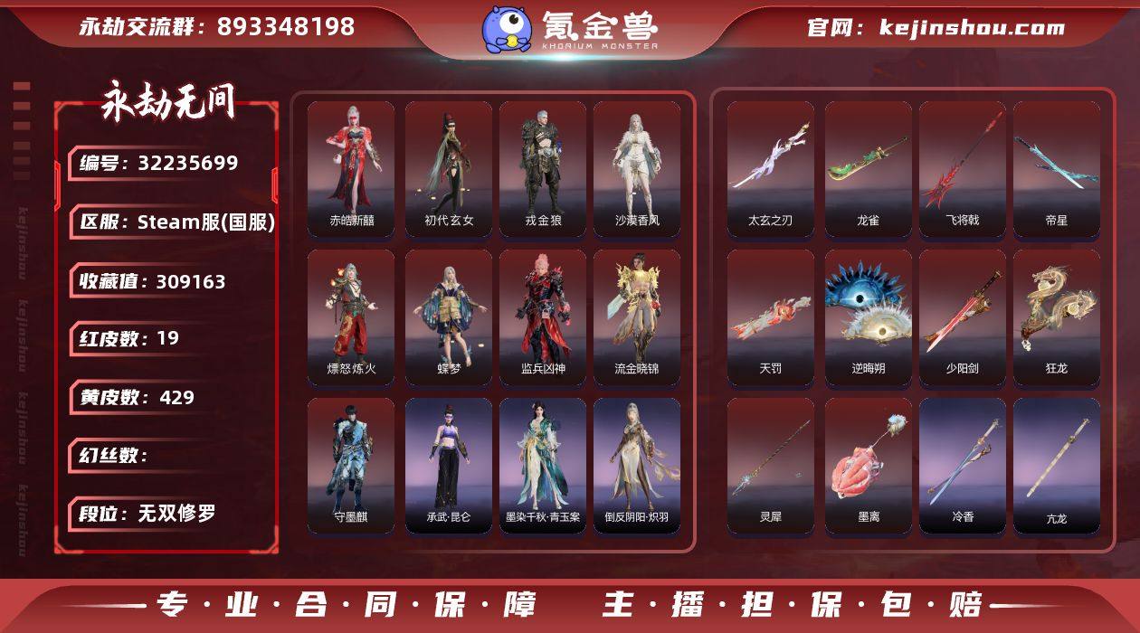 国服永劫无间steam账号,427级单排无双修罗,双排无双修罗,三排黄金,19个神品外观 ,428个极品外观,且有495811幻丝与2090金砖 通行证已升级 117级 且steam账号内还有消失的光芒,森林,求生之路2,战地5等游戏