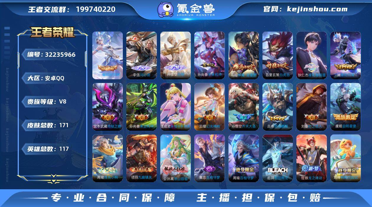 MCK630938 皮肤数量171 印记总数5 【V8】 【至圣王者】 【可修改】 账号类型3 无双2 荣耀典藏1 星元皮肤1 传说12 史诗47 账号类型:打野号,上单号,射手号; 无双:李信_问心剑,孙悟空_无相; 荣耀典藏:伽罗_最初的交响; 星元皮肤:孙尚香_未来机甲; 传说:虞姬_启明星使,百里玄策_白虎志,马超_神骥·逐星野,宫本武藏_地狱之眼,刘备_时之恋人,云缨_幻光神枪,澜_逐花归海,孙尚香_末日机甲,王昭君_永恒水手月亮,狄仁杰_夜礼服假面,孙悟空_齐天大圣,吕布_怒海麟威; 史诗:西施_诗语江南,项羽_九幽镇关,曹操_幽灵船长,周瑜_线条小狗,元歌_云间偶戏,公孙离_涂山容容,赵云_未来纪元,黄忠-百相守梦,周瑜_百相守梦,刘禅_绅士熊喵,后羿_石田雨龙,露娜_紫霞仙子,宫本武藏_鬼剑武藏,狄仁杰_鹰眼统帅,诸葛亮_黄金分割率,刘禅_鸭鸭历险记,狂铁_龙之律动,白起_星夜王子,阿珂_化蝶舞,孙膑_茶境仙,芈月_瑰影绮梦,赵怀真_器灵浮梦炉,夏侯惇_乘风破浪,廉颇_地狱岩魂,兰陵王_暗隐猎兽者,澜_赏金猎手,阿珂_节奏热浪,嫦娥_拒霜思,蒙犽_百解令,刘禅_电玩爆裂旋风,扁鹊_奇幻香踪,夏洛特_永昼,沈梦溪_匿光破解者,李元芳_逐浪之夏,狄仁杰_魔术师,孙悟空_至尊宝,亚瑟_心灵战警,铠_青龙志,李白_千年之狐,娜可露露_晚萤,赵云_皇家上将,暃_星界游侠,貂蝉_唤灵魅影,孙尚香_水果甜心,孙策_猫狗日记,王昭君_偶像歌手,妲己_魅力维加斯;