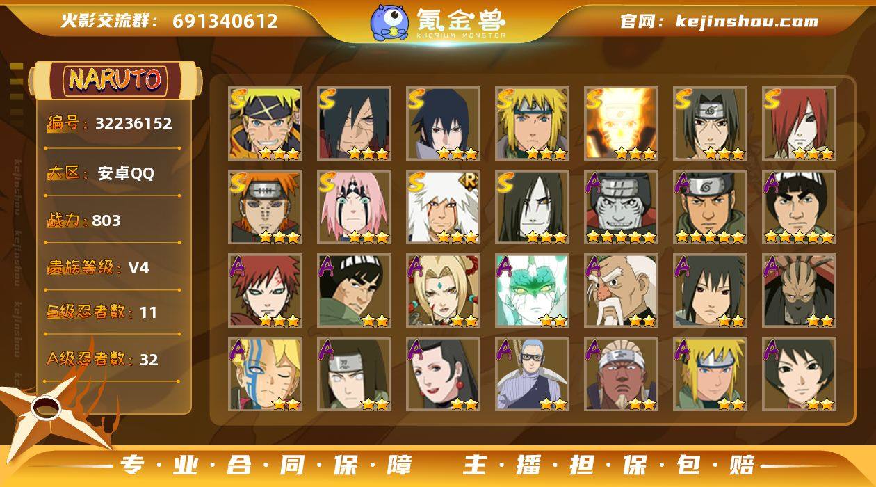【HY721】11S级忍者数-32A级忍者数【S级忍者】:长门「秽土转生」(3星),宇智波斑「秽土转生·解」(3星),春野樱「忍界大战」(3星),宇智波鼬「须佐能乎」(3星),自来也「舞之豪杰」(3星),大蛇丸(3星),波风水门(3星),漩涡鸣人「九喇嘛连结」(3星),佩恩「天道」(3星),宇智波佐助「永恒万花筒」(3星),漩涡鸣人·宇智波佐助(3星)【A级忍者】:艾「青年」(2星),波风水门「青年」(2星),迪达拉(2星),迪达拉「秽土转生」(2星),飞段(2星),飞段「死司凭血」(2星),干柿鬼鲛(5星),漩涡博人「桃式显现」(2星),漩涡鸣人「九尾查克拉」(2星),迈特凯(5星),我爱罗「疾风传」(3星),蝎(2星),蝎「绯流琥」(2星),小南「神驹佑将」(2星),猿飞阿斯玛(5星),宇智波鼬(2星),宇智波佐助「须佐能乎」(2星),宇智波佐助「万花筒写轮眼」(2星),照美冥「五代目水影」(2星),日向宁次「忍界大战」(2星),长十郎「六代目水影」(2星),猿飞木叶丸「博人传」(2星),黑土「博人传」(2星),秋道丁次「忍界大战」(2星),千代「近松十人卫」(2星),志村团藏(2星),不缘(2星),宇智波泉奈(2星),大野木「侠隐江湖」(2星),巳月「仙人模式」(2星),纲手「妖怪奇谭」(2星),迈特凯「青春爆炸」(2星...