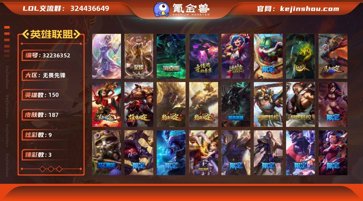 【龙瞎】未定级段位-150英雄-187皮肤-9炫彩-1终极-5神话-34限定-20传说-49史诗 【神话皮肤】:十周年纪念安妮,暗星科加斯,神凰行者瑞羽圣凰艾尼维亚,摄魂使者薇恩,至臻KDA阿狸 【至臻皮肤】:至臻KDA阿狸 【臻彩皮肤】:冠军之刃锐雯2016凯旋圣装,冠军之隐劫凯旋圣装,最终BOSS维迦里大魔王 【年限皮肤】:龙的传人李青,替父从军花木兰,神龙烈焰金克丝,张辽文远,南天之怒沃里克,北辰之威内瑟斯 【海克斯皮肤】:摄魂使者薇恩 【冰雪限定】:圣诞开心鬼提莫,圣诞狂欢基兰,阿木木“主人不要我了”,平安夜女神娑娜,邪恶圣诞老人维迦,喜庆之树茂凯,雪默丁格,圣诞玩偶波比,寒冬精灵璐璐,圣诞捣蛋鬼金克丝 【终极皮肤】:大元素使拉克丝 【限定皮肤】:冠军典狱长锤石,暗杀星蒙多,SKTT1薇恩,SKTT1阿兹尔,SKTT1瑞兹,SKTT1艾克,SKTT1烬,安妮梦游仙境,胜利之剑亚托克斯,胜利枪神卢锡安,泳池派对雷克顿,密林猎手提莫,女猎手希维尔,外星装甲库奇,暗影沃里克,野兽猎人德莱文,野兽猎人泰达米尔,都铎王朝图奇 【传说皮肤】:魔幻卡牌崔斯特,邪鸦魅影乐芙兰,源计划林易,女皇艾希,源计划联合艾希,绅士科加斯,双重冰晶艾尼维亚,电玩女神娑娜,冰霜之刃艾瑞莉娅,女主播迦娜,最终BOSS维迦,女警狙击凯特琳,陆地王者4WD布里茨,炼狱魔犬内瑟斯,冰霜亚龙希瓦娜,符文战熊沃利贝尔,宇航员诺提勒斯,女校长菲奥娜,泳池派对吉格斯,蔷薇绅士杰斯 【史诗皮肤】:特战先锋赵信,翼骑统领赵信,圣光审判凯尔,天人合一易,铁血剑豪易,钢铁之心希维尔,圣洁化身索拉卡,熊猫提莫,法国皇室厄运小姐,紫晶射手艾希,炼金狂士辛吉德,死神卡尔萨斯,战争血统蒙多,恐惧新星普朗克,抵抗军天使凯特琳,前线指挥官卡特琳娜,沙漠风暴卡特琳娜,源计划雄心卡特琳娜,符文战神雷克顿,斗战胜佛孙悟...