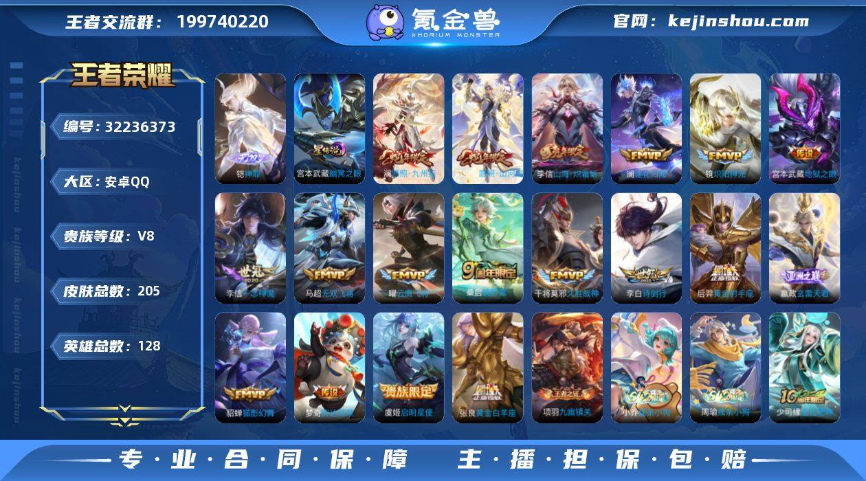 BHC52495-万战澜/2星元-安卓Q-V8-至尊星耀IV段位-128英雄-205皮肤-1典藏英雄-1无双-18传说-64史诗-钱包未注销 【荣耀典藏】:武则天英雄 【无双皮肤】:铠神罪 【传说皮肤】:司空震愿照山河定,澜愿照九州拓,嬴政玄雷天君,桑启鸣野蒿,澜逐花归海,李信山海炽霜斩,李白诗剑行,马超无双飞将,镜炽阳神光,虞姬启明星使,曜云鹰飞将,李信一念神魔,貂蝉猫影幻舞,张良黄金白羊座,干将莫邪久胜战神,梦奇胖达荣荣,后羿黄金射手座,宫本武藏地狱之眼 【限定皮肤】:姜子牙天穹之誓,狄仁杰阴阳师,赵云皇家上将,赵云百木心枪,孙尚香蔷薇恋人,元歌无心,马可波罗暗影游猎,狄仁杰魔术师,达摩沙漠行僧,项羽海滩派对,韩信傲雪梅枪,兰陵王金庭之子,孙悟空孙行者,李元芳云中旅人,虞姬启明星使,女娲朔望之晖,干将莫邪胡桃夹子,鬼谷子五谷丰年,百里玄策原初追逐者,沈梦溪大漠名商,裴擒虎擒涛扼浪,李信山海炽霜斩,鲁班大师探海日志,桑启海盐诗旅,阿古朵江河有灵,张良古海寻踪,妲己灵卜魔法,鬼谷子天穹祈灯,沈梦溪龙舞盛年,鲁班七号蔬乡物语,李元芳蔬乡物语,刘邦剑破天穹,程咬金群星魔术团,周瑜熔金海岸 【年限皮肤】:李信山海炽霜斩,司空震愿照山河定,澜愿照九州拓 【赛季限定】:达摩沙漠行僧,兰陵王金庭之子,沈梦溪大漠名商,李元芳云中旅人,桑启海盐诗旅,裴擒虎擒涛扼浪,鲁班大师探海日志,张良古海寻踪,鬼谷子天穹祈灯,刘邦剑破天穹,姜子牙天穹之誓,东皇太一噬灭天穹,太乙真人谧流熔炉,钟馗虚灵犬护,甄姬逆浪荇歌,亚瑟荣光之誓,百里玄策原初追逐者,牛魔星界战将,项羽九幽镇关 【战令限定】:女娲朔望之晖,马可波罗暗影游猎,妲己灵卜魔法,鲁班七号蔬乡物语,李元芳蔬乡物语,亚连破空之剑,孙悟空神迹守卫,孙膑茶境仙,马超访茗客,莱西奥光弋星穹,明世隐往...