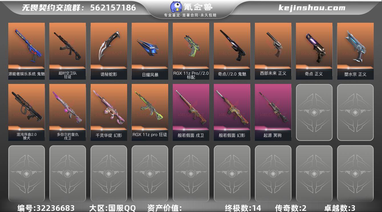 【英雄】:幻棱,炼狱,维斯,暮蝶,钛狐,壹决,铁臂,捷风,雷兹,幽影,不死鸟,贤者,猎枭,蝰蛇,零,芮娜,奇乐,尚勃勒,霓虹,斯凯,夜露,星礈,K/O,海神,盖可,黑梦,钢锁 【近战武器】:近战武器-鬼丸国纲,近战武器-离子武器//2.0 爪刀,近战武器-影刃,近战武器-诡秘蛇影 军刀,近战武器-日耀风暴 遗器,近战武器-阿特拉斯指挥部 甩棍 【狂徒】:狂徒-洪荒怒焰,狂徒-全息波普//2.0,狂徒-RGX 11z Pro,狂徒-海洋之星,狂徒-离子武器//2.0,狂徒-诡秘蛇影 【幻影】:幻影-黯夜怪谈,幻影-异鳞魔蛇,幻影-末日之翼 【戍卫】:戍卫-掠影,戍卫-折光棱晶 【冥驹】:冥驹-千灵华绽,冥驹-堕天遗武 【飞将】:飞将-末日之翼 【莽侠】:莽侠-诡秘蛇影 【奥丁】:奥丁-末日之翼 【判官】:判官-诡秘蛇影 【蜂刺】:蜂刺-折光棱晶 【标配】:标配-折光棱晶 【正义】:正义-奇点 【鬼魅】:鬼魅-盖亚的复仇,鬼魅-诡秘蛇影,鬼魅-扑棱扑棱 【短炮】:短炮-末日之翼 【卡面】:《双城之战》拥抱 卡面,精灵大战 卡面,欢迎来到底城 卡面,南瓜盛典 卡面,无畏契约:暮蝶 卡面,红鳞松叶 卡面,无畏契约GO!第一卷:芮娜 卡面,无畏契约GO!第一卷:零 卡面,《双城之战》...