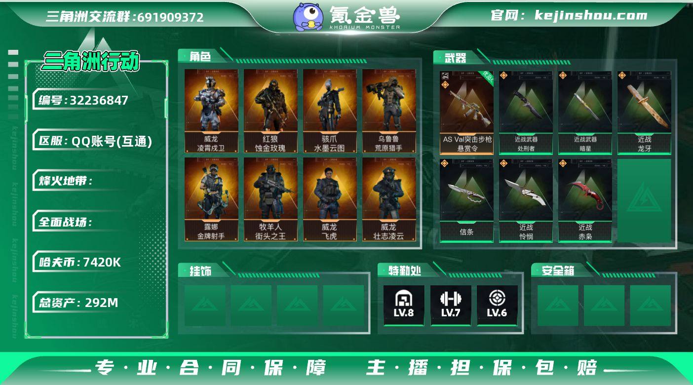 S1443总资产292M,哈夫币742w,典藏1 近战7 枪皮数量340,威龙-凌霄戍卫/红狼-蚀金玫瑰/骇爪-水墨云图/乌鲁鲁-荒原猎手/露娜-金牌射手/无名-夜鹰/威龙-壮志凌云/威龙-飞虎/蜂医-送葬人无题密令/牧羊人-街头之王,近战-暗星/近战-处刑者/近战-龙牙/近战-信条/近战-怜悯/近战-赤枭,AS Val突击步枪-悬赏令(优品C)战场等级50列兵, 行动等级60三角洲巅峰,安全箱等时效性道具请以游戏内数据为准,详情请看图