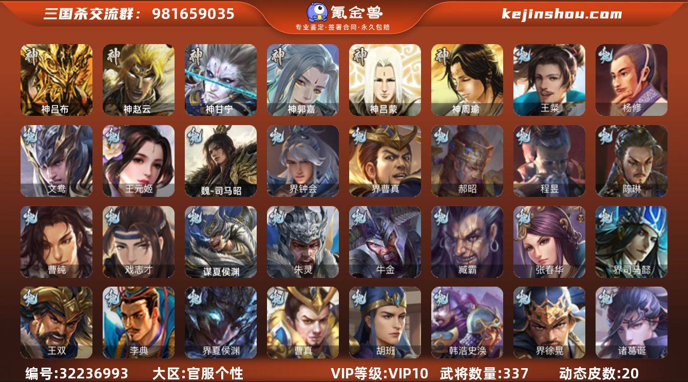 VIP等级: VIP10 官阶: 骠骑将军 武将数量: 337 动态皮肤数量: 20 神将: 神甘宁,神郭嘉,神吕布,神赵云,神吕蒙,神周瑜 魏国武将: 戏志才,曹纯,陈琳,程昱,郝昭,界曹真,界钟会,魏-司马昭,王元姬,文鸯,杨修,王粲,唐咨-魏,张辽,SP蔡文姬,SP曹仁,SP关羽,SP贾诩,SP姜维,SP庞德,卞夫人,蔡贞姬,曹昂,曹操,曹冲,曹洪,曹丕,曹仁,曹叡,王异,张恭,鲁芝,曹休,界曹植,满宠,荀攸,王基,钟繇,蒯越蒯良,郭嘉,牵招,荀彧,杜畿,界郭嘉,崔琰,界曹丕,朱灵,界甄姬,界王异,界许褚,界郭淮,陈群,界邓艾,界典韦,谋甄姬,袁涣,乐进,辛宪英,郭淮,郭皇后,毌丘俭,夏侯惇,曹植,司马朗,谋于禁,界曹操,许褚,界张辽,张郃,钟会,文聘,曹彰,界夏侯惇,诸葛诞,司马懿,甄姬,界徐晃,徐晃,韩浩史涣,胡班,曹真,典韦,界夏侯渊,谋荀彧,夏侯渊,李典,于禁,王双,邓艾,界司马懿,张春华,臧霸,牛金,朱灵(国战),谋夏侯渊 蜀国武将: 花鬘,谯周,沙摩柯,赵襄,谋马超,马云騄,徐庶,杨仪,界关羽,界诸葛亮,邓芝,界伊籍,费祎,界黄月英,界张嶷,赵云,张松,彭羕,李丰,界刘备,谋姜维,刘封,糜竺,谋庞统,黄月英,关羽,王甫赵累,吴懿,祝融,张飞,魏延,马忠,界法正,糜夫人,界孟获,刘禅,界赵云,界姜维,张翼,界祝融,SP孙尚香,SP徐庶,卧龙诸葛,周仓,简雍,界关兴张苞,诸葛亮,界张飞,法正,界简雍,赵统赵广,陈到,界马岱,关平,马岱,庞统,诸葛果,马谡,马超,霍峻,廖化,关兴张苞,孟获,夏侯氏,姜维,黄忠,刘备,界马超,李严,马良,傅肜,刘谌,彭羕(国战),甘夫人,蜀-糜芳傅士仁,SP甘夫人,势陈祗 吴国武将: 界步练师,界徐盛,界朱然,留赞,骆统,文鸯,潘濬,周泰,全琮,吕蒙,诸葛恪,界孙尚香,界顾雍,大乔小乔,谋甘宁,桥公,谋周瑜,许贡,丁奉,周鲂,蒋钦,顾雍,阚泽,孙亮,界朱治,孙休,严畯,界孙权,孙翊,界凌统,祖茂,界虞翻,界吕蒙,孙登,凌操,朱治,孙尚香,程普,大乔,韩当,陆逊,诸葛瑾,朱然,吕范,太史慈,周妃,虞翻,界黄盖,孙...