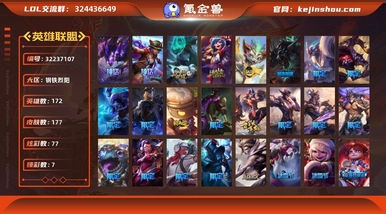 未定级段位-172英雄-177皮肤-77炫彩-0终极-4神话-24限定-11传说-36史诗 【神话皮肤】:十周年纪念安妮,源代码乐芙兰,十五周年纪念希维尔,水晶掠夺者卡兹克 【臻彩皮肤】:无畏骑士瑟庄妮赤子初心,神龙尊者圣龙李青登龙,霸天巨兽雪崩墨菲特,星之吞噬者莫甘娜热情之末,可爱可爱粉红红布里茨,魔女阿卡丽虚荣 【年限皮肤】:天龙之子斯莫德,点心宝贝阿木木,龙马烈焰波比 【情人节限定】:觅心之翼奎因 【冰雪限定】:圣诞精灵崔丝塔娜,圣诞玩偶波比,圣诞老人古拉加斯,魄罗骑士瑟庄妮 【限定皮肤】:冠军典狱长锤石,冠军之血希瓦娜,SKTT1薇恩,SSW辛吉德,SKTT1阿兹尔,iG洛,暗裔英雄盖伦,胜利之王泰达米尔,胜利巨口克格莫,胜利剑圣易,胜利之运崔斯特,破空枪骑孙悟空,暗影沃里克,都铎王朝图奇,玉剑传说舞龙卫,双城之战2微光实验室辛吉德 【传说皮肤】:战场女武神凯尔,钢铁之翼凯尔,源计划林易,恶魔男爵瑞兹,提莫约德尔人的一大步,合金巨兽努努和威朗普,女警狙击凯特琳,上古战魂魔腾,宇航员诺提勒斯,灌篮高手德莱厄斯,神王德莱厄斯 【史诗皮肤】:特战先锋赵信,绞肉机角斗士赵信,屠龙勇士赵信,天人合一易,铁血剑豪易,钢铁之心希维尔,百夫长贾克斯,掠星魔刃卡萨丁,夜刃艾瑞莉娅,穿着正装的恶魔维迦,枯萎之壤雷克顿,暗星嘉文四世,灵骨工匠奥莉安娜,三昧真火孙悟空,防弹武僧李青,地下拳王李青,屠龙勇士薇恩,法老王朝内瑟斯,星之守护者波比,飞车暴走族古拉加斯,钢铁意志潘森,大夏武士潘森,铁甲雄心盖伦,源计划山蕾欧娜,侏罗纪化石克格莫,银河魔装机神希瓦娜,暗星韦鲁斯,皇家守卫菲奥娜,铁血帝皇德莱厄斯,暗黑女武神黛安娜,无限烈焰黛安娜,亚特兰蒂斯辛德拉,邪恶魔人扎克,源计划风亚索,冰雪游神巴德,暮星之羽霞 【王者皮肤】:星空之门内瑟斯,死亡...