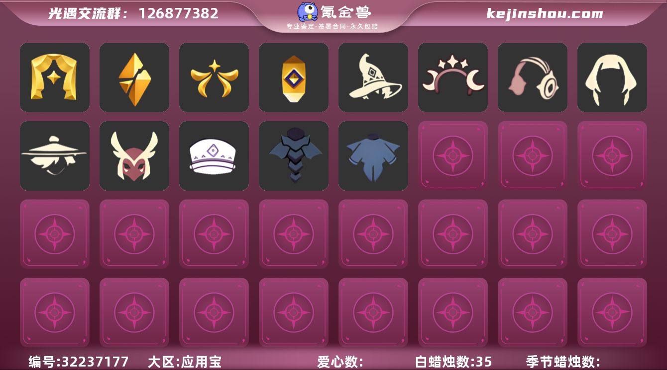 蜡烛数:35/爱心数:14/表演季/破晓季/欧若拉季/追忆季/黄眉企鹅面具/燕尾斗篷/冥龙斗篷/留辫蘑菇头/高领舞服/透明蝶翼斗/肩带/追忆之书/巫师/星月头饰/彩虹耳机/若笠/平顶帽/星月头冠/猫猫头/帝企鹅发/贝壳发饰/玉兔发饰