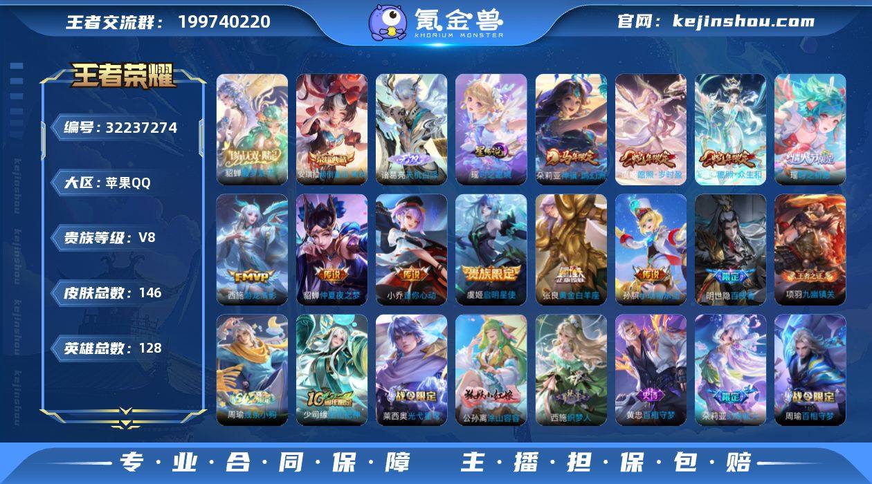 漂亮女号 贵族等级: V8 英雄数: 128 皮肤数: 146 荣耀水晶: 颠倒童话·魔镜 无双皮: 天机白泽 星传说: 时之愿境 传说皮: 黄金白羊座,仲夏夜之梦,音你心动-小乔,游龙清影,小动物乐团,神骥·鸣幻洲 限定皮: 遇见飞天,魔法小厨娘,时之祈愿-瑶,五谷丰年,山海·碧波行,至美·乘鲤谣,愿照·众生和,愿照·岁时盈
