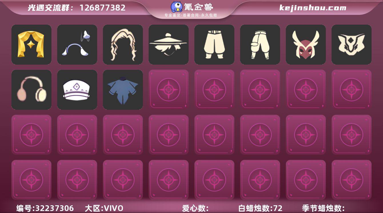 蜡烛数:72/爱心数:28/霞谷/表演季/单边小辫/黄眉企鹅面具/燕尾斗篷/活力海牛礼包/武士裤/搓澡巾/虚荣/红耳机/若笠/平顶帽/白金斗篷/黑金斗篷/红金斗篷/黄鼠狼/帝企鹅发/玉兔发饰/创始人斗篷