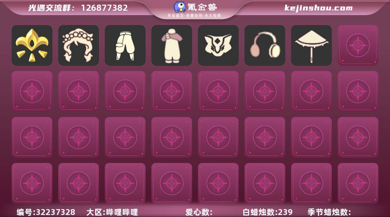 蜡烛数:239/爱心数:33/云野/雨林/霞谷/墓土/禁阁/集结季/凤凰斗篷/胜利号角/连帽斗篷/背带裤/搓澡巾/花环/红耳机/白金斗篷/红金斗篷/雨伞/黄鼠狼/花环长发/创始人斗篷/情人跷跷板