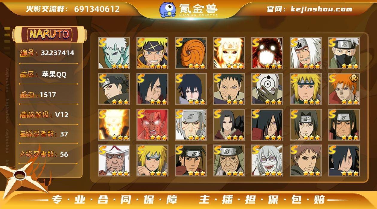 实名: 可修改 贵族等级: V12 S忍数: 37 A忍数: 56 战力值(万): 1517 通灵兽: 忍犬,忍龟,蛤蟆吉,蓝蛇,猿魔,蛞蝓,蛤蟆仙人,镰鼬,山椒鱼,蜃,鲛鲨,蛤蟆健,乌鸦,蛤蟆龙,熊猫,蛤蟆广,梦貘,鹰,二尾又旅,砂之守鹤,零尾,十周年限定威装须佐,豚豚