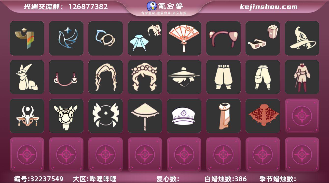 蜡烛数:386/爱心数:186/晨岛/雨林/霞谷/墓土/禁阁/彩染季/青鸟季/双星季/合奏挂画/姆明大伞/辉光羚羊面具/彩染围巾斗篷/青鸟毕业面饰/青鸟斗篷/蓝色星星光环/暮星斗篷/周年影院套餐礼包/巫师/粽子发饰礼包/满月耳坠/星球夹克/蛛网斗篷/青衫落拓礼包/献瑞折扇礼包/花憩茶桌/小狐狸/武士裤/搓澡巾/击剑裤/虚荣/花环/若笠/平顶帽/白金斗篷/雨伞/羊头面具/花环长发/玉兔发饰/围巾斗篷/小王子围巾