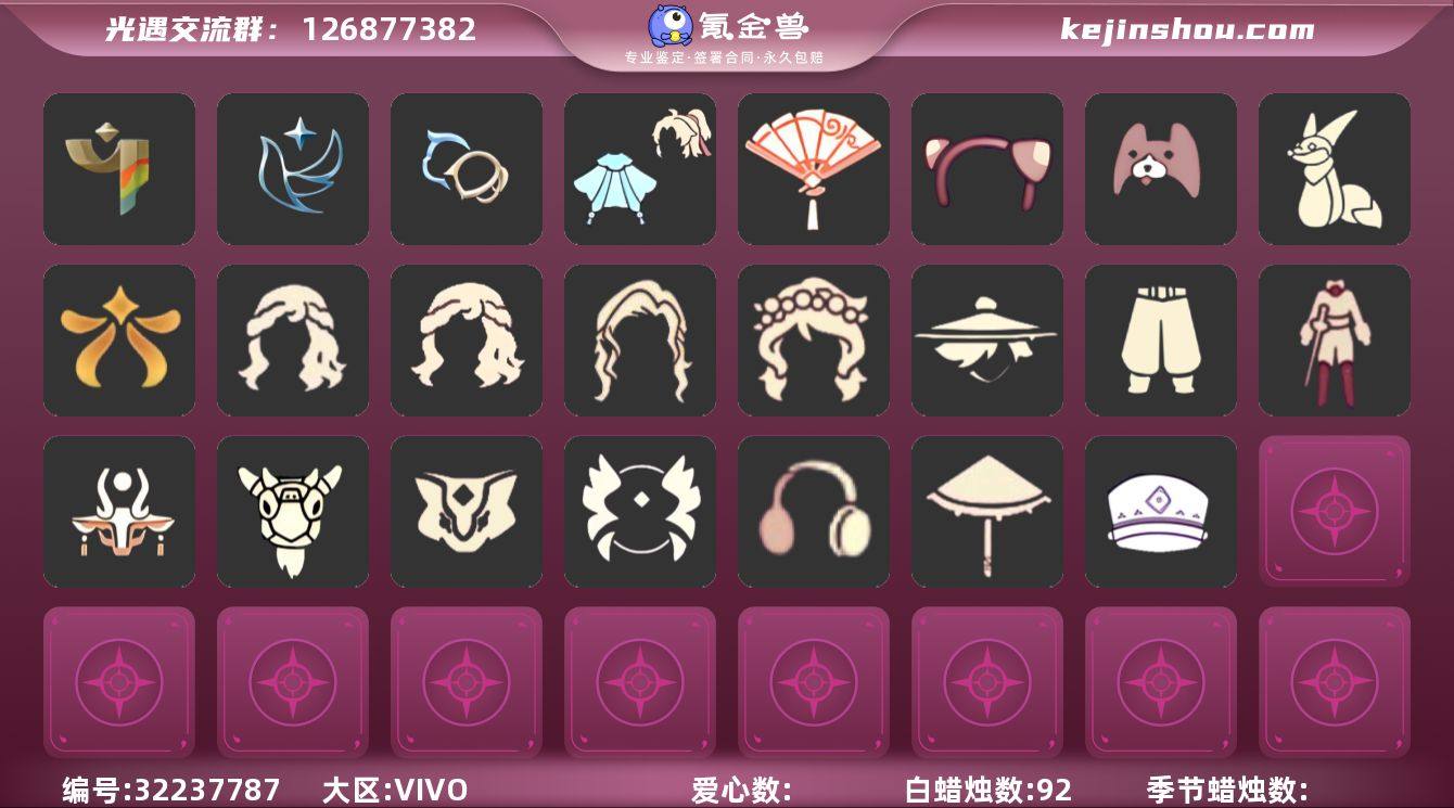 蜡烛数:92/爱心数:85/彩染季/青鸟季/双星季/迁徙季/辉光羚羊面具/青鸟毕业面饰/青鸟斗篷/蓝色星星光环/暮星斗篷/蓝色毛绒绒鞋/蓝色毛绒裤子/海牛鹿角头饰/海蓝波浪发型/小狗周年发饰/粽子发饰礼包/欧若拉之翼/青衫落拓礼包/献瑞折扇礼包/小狐狸/周年庆抱枕/武士裤/击剑裤/虚荣/花环/红耳机/若笠/平顶帽/白金斗篷/黑金斗篷/雨伞/黄鼠狼/羊头面具/猫猫头/花环长发/小王子围巾