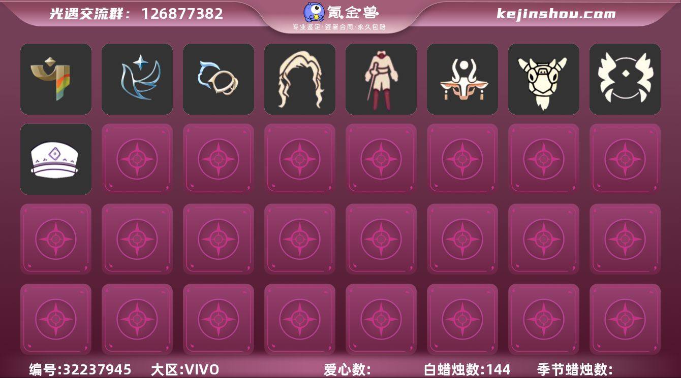 蜡烛数:144/爱心数:35/彩染季/青鸟季/双星季/迁徙季/辉光羚羊面具/青鸟毕业面饰/青鸟斗篷/蓝色星星光环/暮星斗篷/蓝色毛绒绒鞋/蓝色毛绒裤子/海牛鹿角头饰/击剑裤/虚荣/平顶帽/羊头面具/猫猫头