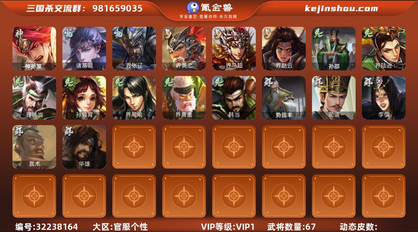 【3299】官阶:先锋将军;VIP等级:VIP1;史诗武将数量:2;动态皮肤数量:0;武将总数:67;史诗宝珠数量:0;将魂数量:3595;神将:1;魏国史诗武将:0;蜀国史诗武将:1;吴国史诗武将:0;群史诗武将:0 神孙策,界黄忠,诸葛诞,界张辽,界赵云,界马超,孙鲁育,韩当,界黄盖,界周瑜,界陆逊,界韩当,孙邵,张布,李儒,华雄,袁术,荀谌,势田丰