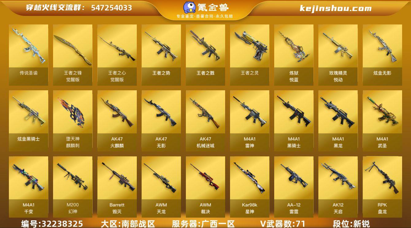 【ylw-cf1072】广西一区-73V-12王者-2炫金 【传说武器】:传说圣谕 【传说角色】:传说星骇 【热门武器】:传说圣谕,M200-幻神,死亡之眼,Kar98K-星神,M4A1-黑骑士,汤姆逊-烈龙*7,RPK-盘龙*7,加特林-炼狱*2,沙鹰-修罗*5 【王者炫金武器】:王者之戮,王者之势,玫瑰精灵-悦动,王者玄武,炼狱-悦蓝*2,王者之灵,王者冰锋,炫金骑士,炫金无影 【音效卡】:Barrett-毁灭音效卡,AWM-裁决音效卡 【皮肤】:QBZ03-AG-CFPLS19冠军,裁决-巅峰荣耀 皮肤,星神-璀璨皮肤,雷神-暗月,雷神-能量核心,雷神-荣耀之魄,雷神-耀金皮肤,毁灭-暗月,毁灭-星空,黑龙-暗月,黑骑士-暗月,无影-暗月*2,无影-能量核心,天启-暗月,天龙-秘银,极光-能量核心,修罗-能量核心*4,屠龙-荣耀之锋*2 【角色】:葵,瞳,雪域霜狐,蛇隐宗,云海玲珑,暗夜-X,芳心审判者,兰-海滩派对,零-水下丽影,灵狐者-七夕宝贝,潘多拉-X,青霞仙子,蛇姬,兔囡囡,影武者-X 【人偶武器】:生化手雷-机甲核心 【暴走生化】:死亡之眼,超级对讲机 【挑战大师】:神圣爆裂者III,冰龙粉碎者-白马银枪,激光毁灭者III 【英雄级武器】:M4A1-千变,AK47-火麒麟,M4A1-黑龙,M4A1-雷神,M4A1-黑骑士,AK47-无影,AK12-天启,M4A1-武圣,AK47-机械迷城*5,王者之心-觉醒版,AK-47-猩红传说,AWM-天龙*3,Barrett-毁灭*2,AWM-裁决,M200-幻神,Kar98K-星神,RPK-盘龙*7,加特林-炼狱*2,汤姆逊-烈龙*7,AA-12-雷霆,沙鹰-修罗*5,沙鹰-天神*2,屠龙*4,龙啸*2,麒麟刺-堕天神,擎天,麒麟刺,斩神刀-雷暴,王者之锋-觉醒版,高爆手雷-雷霆,高爆手雷-雷暴,高爆手雷-堕天神,高爆手雷-古蛇迷踪,闪光弹-雷霆,闪光弹-雷暴,闪光弹-堕天神,烟雾弹-雷霆,烟雾弹-雷暴,烟雾弹-堕天神,烟雾弹-古蛇迷踪 【道具】:AG战队炫彩背包,亚洲杯纪念炫...