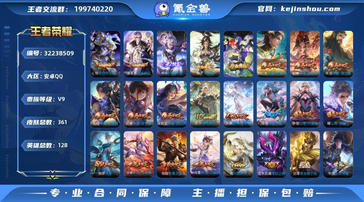 128英雄-361皮肤-安卓QQ/v9至尊星耀/,马年限定全皮/打野男号/孙悟空,齐天大圣 孙悟空,永曜之星 杨戬,诗剑行 李白,灼幽烈阳 东皇太一,仲夏夜之梦 貂蝉,落雪白狼 亚连,神骥·赴朔漠 狄仁杰,神骥·鸣幻洲 朵莉亚,影龙天霄 兰陵王,神骥·聚万邦 貂蝉,神骥·逐星野 马超,地狱之眼 宫本武藏,神骥·镇沧海 关羽,神骥·越千峰 云缨,鹤羽星尊 诸葛亮,海洋之心/361皮肤/128英雄/2典藏/0珍品无双/1无双/2珍品传说/44传说/115史诗/9稀有英雄 【2 珍品传说】沧流箭 伽罗,时之奇旅 孙策, 【2 典藏皮肤】银白咏叹调 铠,星域神启 诸葛亮, 【1 无双皮肤】群星魔术团 韩信, 【44 传说皮肤】启明星使 虞姬,无双飞将 马超,地狱火 孙悟空,齐天大圣 孙悟空,永曜之星 杨戬,诗剑行 李白,灼幽烈阳 东皇太一,仲夏夜之梦 貂蝉,落雪白狼 亚连,神骥·赴朔漠 狄仁杰,神骥·鸣幻洲 朵莉亚,影龙天霄 兰陵王,神骥·聚万邦 貂蝉,神骥·逐星野 马超,地狱之眼 宫本武藏,神骥·镇沧海 关羽,神骥·越千峰 云缨,鹤羽星尊 诸葛亮,海洋之心 武则天,时雨天司 诸葛亮,炽阳神光 镜,黄金射手座 后羿,霜月吟 露娜,怒海麟威 吕布,乘龙·问璇玑 孙尚香,时之恋人 刘备,黄金狮子座 达摩,久胜战神 干将莫邪,乘龙·淬吴钩 孙策,末日机甲 孙策,山海·炽霜斩 李信,一念神魔 李信,战鼓燎原 典韦,画中仙 干将莫邪,山海·琳琅生 小乔,太华 伽罗,妄想实况 马可波罗,山海·苍雷引 曜,黄金白羊座 张良,群星魔术团 云中君,黄金天蝎座 墨子,神树通天 后羿,愿照·千秋盛 女娲,鸣野蒿 桑启, 【115 史诗皮肤】电玩小子 鲁班七号,末日机甲 吕布,蔬乡物语 鲁班七号,紫霞仙子 露娜,百解令 蒙犽,高山流水 庄周,暗影游猎 马可波罗,冰霜恋舞曲 干将莫邪,苍穹之光 项羽,天秀·启明 杨戬,猫狗日记 大乔,德古拉伯爵 刘邦,山海·玄木吟 马可波罗,心灵战警 亚瑟,五谷丰年 鬼谷子,无心 元歌,鬼剑武藏 宫本武藏,百相守...