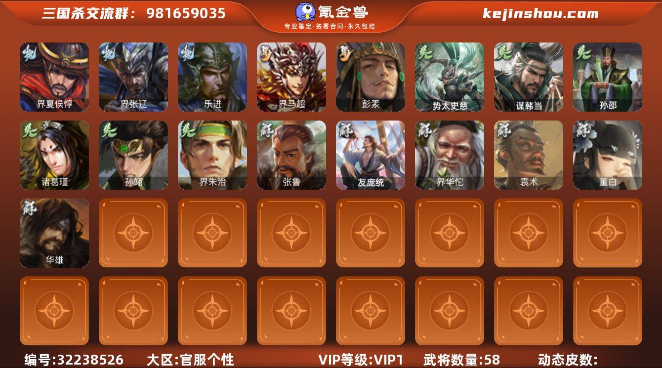 【3302】官阶:先锋将军;VIP等级:VIP1;史诗武将数量:1;动态皮肤数量:0;武将总数:58;史诗宝珠数量:0;将魂数量:4014;神将:0;魏国史诗武将:0;蜀国史诗武将:0;吴国史诗武将:1;群史诗武将:0 势太史慈,乐进,界夏侯惇,界张辽,界马超,彭羕,诸葛瑾,孙邵,孙翊,谋韩当,界朱治,友庞统,华雄,袁术,界华佗,张鲁,董白