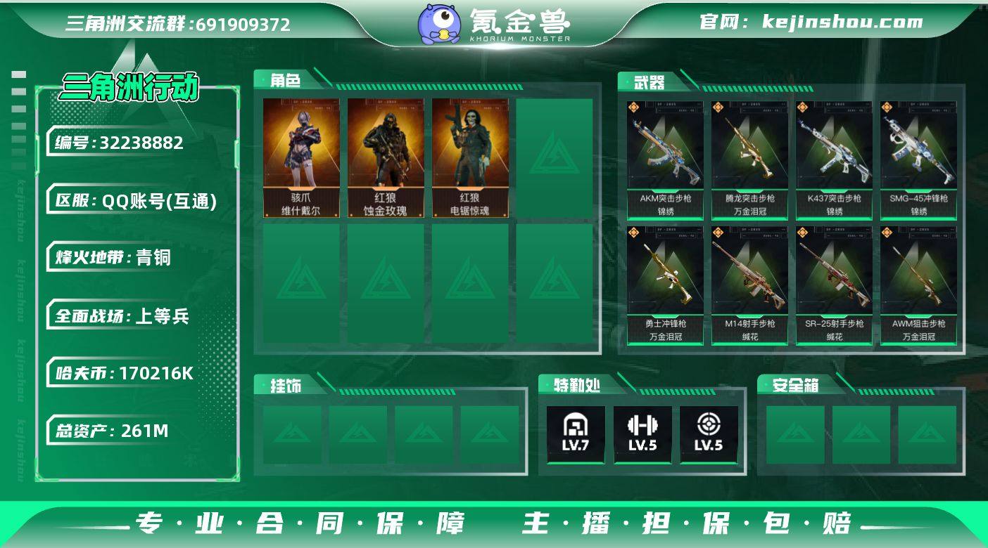 QQA95/可二次/QQ区【0封禁】【261M总资产(170M纯币)】+【红狼-蚀金玫瑰】【骇爪-维什戴尔】+20发AWM子弹/烽火等级:56级/全面战场:35级/纯币:170M/三角券加币:100(0三角币+100三角券)【红狼-电锯惊魂】//部门:22321/特勤等级(技术中心满级/工作台满级/制药台满级/防具台满级/仓库7级/指挥中心5级/训练中心5级/靶场6级/潜水中心1级/收藏室1级)(流动资产:236.8M)---(锦绣+万金泪冠+缄花)捆绑包---M4A1突击步枪-蚀金玫瑰/SCAR-H战斗步枪-启航/M4A1突击步枪-阿米娅/CAR-15突击步枪-阿米娅/3橙色挂饰/段位:青铜III/详细看图