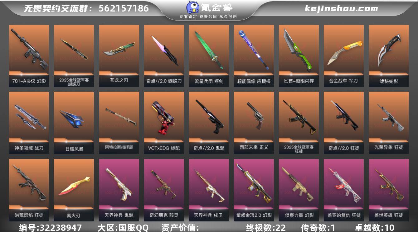 【套装】:2025全球冠军赛套装,离火刃套装,奇点//2.0套装,VCTxEDG 队伍套装,无畏启程套装,离火刃套装 【英雄】:幻棱,炼狱,维斯,暮蝶,钛狐,壹决,铁臂,捷风,雷兹,幽影,不死鸟,贤者,猎枭,蝰蛇,零,芮娜,奇乐,尚勃勒,霓虹,斯凯,夜露,星礈,K/O,海神,盖可,黑梦,钢锁 【近战武器】:近战武器-2025全球冠军赛 蝴蝶刀,近战武器-5周年//公测重制版 苍龙之刃,近战武器-奇点//2.0 蝴蝶刀,近战武器-紫金爪刀,近战武器-离火刃,近战武器-镭切,近战武器-流星兵团 短剑,近战武器-超能偶像 应援棒,近战武器-超限闪存 匕首,近战武器-定海神珍,近战武器-合金战车 军刀,近战武器-诡秘蛇影 军刀,近战武器-神圣领域 战刀,近战武器-日耀风暴 遗器,近战武器-阿特拉斯指挥部 甩棍 【狂徒】:狂徒-2025全球冠军赛,狂徒-洪荒怒焰,狂徒-奇点//2.0,狂徒-光荣异象,狂徒-堕天遗武,狂徒-掠影,狂徒-盖世英雄,狂徒-盖亚的复仇,狂徒-紫阙金琅,狂徒-超能偶像,狂徒-钢轨卫士,狂徒-流星兵团,狂徒-诡秘蛇影 【幻影】:幻影-781-A协议,幻影-侦察力量,幻影-紫阙金琅//2.0,幻影-超限闪存,幻影-合金战车,幻影-神圣领域,幻影-聚合之力,幻影-战术小伙伴,幻影-末日之翼 【戍卫】:戍卫-天界神兵,戍卫-超能偶像,戍卫-钢轨卫士,戍卫-珍珠棘贝,戍卫-浮光跃金,戍卫-花漾粉红,戍卫-战术熊与伙伴们,戍卫-月球哨兵,戍卫-折光棱晶 【獠犬】:獠犬-神圣领域,獠犬-采蜜小蜂队,獠犬-模拟赫兹,獠犬-数码咒术,獠犬-战术小伙伴 【冥驹】:冥驹-复古浪潮,冥驹-花漾粉红,冥驹-模拟赫兹,冥驹-星云暗涌 【飞将】:飞将-合金战车,飞将-聚合之力,飞将-光导纤维,飞将-战术熊与伙伴们,飞将-末日之翼 【莽侠】:莽侠-超限闪存,莽侠-诡秘蛇影,莽侠-深海水族,莽侠-纤云弄巧,莽侠-月球哨兵 【战神...
