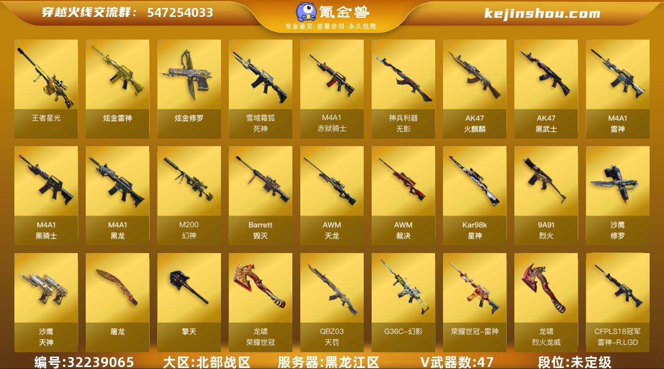 黑龙江区-50V-2王者武器数-2炫金武器数 【热门武器】:G36C-幻影,M200-幻神,荣耀世冠-雷神,Kar98K-星神,M4A1-黑骑士,羊驼玩偶,COP-白鲨*2,沙鹰-修罗*4,荣耀世冠-龙啸 【王者炫金武器】:王者星光,炫金雷神,炫金修罗 【音效卡】:AK47-火麒麟音效卡,AWM-裁决音效卡,Kar98K-星神音效卡,HK417-朱雀音效卡,死神-雪域霜狐-怀旧音效卡 【皮肤】:幻神-丹凤,幻神-电流骇客 皮肤,裁决-流光秘银,星神-璀璨皮肤,雷神-R.LGD-CFPLS18冠军,火麒麟-轻羽皮肤,火麒麟-百城,毁灭-黑大圣皮肤,毁灭-风暴,AWM-天龙-传奇白鲨,麒麟刺-荣耀世冠白鲨 【角色】:关小雨,战地猎狐,王者凌霄,雪域霜狐,修道士,暗夜-X,北极狐-X,初恋灵狐,嘉年华灵狐,灵狐-花神,龙儿,曼陀罗-礼服,斯沃特-X,樱-战斗天使,影武者-X 【人偶武器】:COP-白鲨*2,M4A1-雷神-精英刀锋,斯泰尔-枪娘暗刃,AWM-灵狐-15周年嘉年华,COP-旗袍*2,迷你深渊冰龙,迷你裂空之翼,迷你波特博士,夺魂,深渊终结者手雷,迷你艾比,迷你巨石泰坦-魔花研究所 【暴走生化】:超级对讲机 【挑战大师】:冰龙粉碎者-白马银枪,激光毁灭者III-白马银枪,神圣爆裂者-末日III 【英雄级武器】:AK47-火麒麟*3,M4A1-黑龙,M4A1-雷神,M4A1-黑骑士,AK47-黑武士,QBZ03-天罚,无影-神兵利器,G36C-幻影,FAMAS G2-天戎,死神-雪域霜狐,9A91-烈火,王者猎神-觉醒版,荣耀世冠-雷神,机械迷城-穹宇,AWM-天龙,Barrett-毁灭,AWM-裁决,M200-幻神,Kar98K-星神,沙鹰-修罗*4,沙鹰-天神*9,Anaconda-玄豹,USP-冥王*2,屠龙*7,擎天,荣耀世冠-龙啸,龙啸-烈火龙威,闪光弹-玄豹,M4A1-赤狱骑士 【源级武器】:源·黑骑士,灵·黑骑士-破界 I,源·AK47-黑武士,M4A1-青龙-掌上穿越火线,源·HK417-朱雀,魂·英雄-湾区光枢,AWM-裁决-百