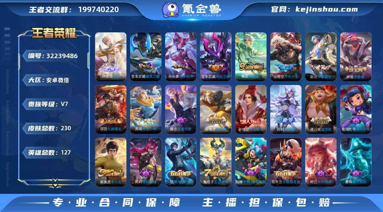 安卓WX-V7-最强王者段位-127英雄-230皮肤-1无双-4传说-54史诗,对抗路21,,打野22,游走25 幸运值249 【无双皮肤】:孙悟空无相 【传说皮肤】:桑启鸣野蒿,孙悟空齐天大圣,赵云淬星耀世,宫本武藏地狱之眼 【限定皮肤】:白起狰,姜子牙天穹之誓,狄仁杰阴阳师,虞姬凯尔特女王,赵云皇家上将,庄周高山流水,高渐离死亡摇滚,高渐离玩趣恶龙,钟无艳超时空战士,扁鹊炼金王,芈月重明,夏侯惇朔风刀,甄姬落雪兰心,曹操烛龙,典韦穷奇,狄仁杰魔术师,狄仁杰万华元夜,达摩沙漠行僧,项羽海滩派对,老夫子醍醐杖,程咬金演武夺筹,兰陵王金庭之子,孙悟空大圣娶亲,孙悟空孙行者,孙悟空齐天大圣,牛魔御旌,李元芳云中旅人,钟馗驱傩正仪,杨玉环遇见飞天,雅典娜黎明之约,蔡文姬繁星吟游,太乙真人饕餮,鬼谷子原初探秘者,鬼谷子五谷丰年,苏烈千军破阵,百里玄策原初追逐者,弈星混沌棋,梦奇顽趣,沈梦溪大漠名商,明世隐疑决卦,裴擒虎李小龙,裴擒虎擒涛扼浪,狂铁御狮,米莱狄御霄,云中君纤云弄巧,盾山御銮,猪八戒猪悟能,上官婉儿梁祝,鲁班大师探海日志,桑启海盐诗旅,艾琳女武神,张良古海寻踪,蒙犽百解令,蒙恬荣光圣徽,鬼谷子天穹祈灯,沈梦溪龙舞盛年,刘邦剑破天穹,程咬金群星魔术团,周瑜熔金海岸 【赛季限定】:扁鹊炼金王,虞姬凯尔特女王,白起狰,太乙真人饕餮,曹操烛龙,芈月重明,典韦穷奇,狂铁御狮,米莱狄御霄,牛魔御旌,盾山御銮,夏侯惇朔风刀,弈星混沌棋,明世隐疑决卦,老夫子醍醐杖,鬼谷子原初探秘者,狄仁杰万华元夜,程咬金演武夺筹,钟馗驱傩正仪,苏烈千军破阵,达摩沙漠行僧,兰陵王金庭之子,沈梦溪大漠名商,李元芳云中旅人,桑启海盐诗旅,裴擒虎擒涛扼浪,鲁班大师探海日志,张良古海寻踪,鬼谷子天穹祈灯,刘邦剑破天穹,姜子牙天穹之誓,东皇太一噬灭...