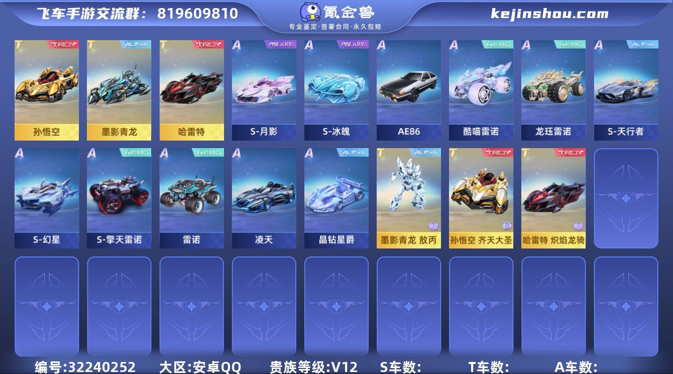 B653384 【5T+5强联赛+2强骑宠-主流7阶竞速机甲/哈雷特7阶炽焰龙骑+墨影青龙敖丙+孙悟空-5阶天使冰魄+幻星+月影+天行者+擎天雷诺-骑宠火狱龙息+瑞泽祥麟/避水金晶兽+小悟空+雀焰女王+铠甲战士-1幻生2魔法/死神男装,十里红妆男装,(幻生)穹梦韶宇男装-炽焰龙骑精简名片夹+社交底板+变色名】 A车数量77 游戏等级93 T车数量5 【否】 【可二次实名】 【永久包赔】 【安卓QQ】 稀有车型4 稀有永久A车2 T车皮肤3 永久T车4 宠物6 稀有车型:擎天雷诺,孙悟空,哈雷特,墨影青龙; 稀有永久A车:酷喵雷诺,龙珏雷诺; T车皮肤:孙悟空齐天大圣,哈雷特炽焰龙骑,墨影青龙敖丙; 永久T车:孙悟空,哈雷特,墨影青龙,鸭宝超人; 宠物:避水金晶兽,雀焰女王,瑞泽祥麟,小悟空,火狱龙息,铠甲战士;