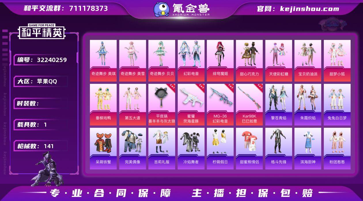 咩咩】c27324-【无二次协助处理】【因赛季更新游戏段付以上号为准!】 苹果Q-1载具12粉装9特效枪7热门108套装141枪皮 4w热力值 6印记 历史超级王牌14星 【1载具】 冰绡玉鳞 【12粉装】 奇迹舞步美雪 奇迹舞步贝贝 奇迹舞步美琪 绯穹魔姬 宝贝奶油派 天使彩虹糖 甜心巧克力 异瞳寒姬 垂柳戏鸭 幻彩电音 第五大道 甜梦小狐 【9特效枪】 AKS-74U-森灵之息 (5级) Kar98K-巳巳如意 (5级) MG-36-幻彩电音 (6级) DP-28-豹影疾电 (5级) 蜜獾-荧海星豚 (7级) AKS-74U-森灵之息 (5级) Mk14-福马献瑞 (5级) UMP45-萌骑冒险 (3级) 平底锅-喜羊羊与灰太狼 (6级) 【7热门】 小丑鱼 红熊茄茄 糯粉咩咩 呆萌铁蟹 兔兔白日梦 漫步者 破蛋小黄鸡 【1头盔】 甜心宝贝头盔 【1背包】 甜心宝贝背包
