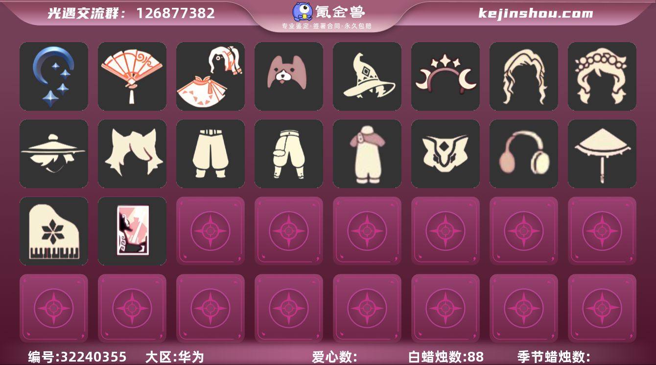 蜡烛数:88/爱心数:86/云野/雨林/霞谷/墓土/禁阁/夜行季/高领舞服/透明蝶翼斗/棕熊面具/绒毛斗篷/巫师/小狗周年发饰/星月头饰/圣诞鹿角/蛛丝斗篷/衔福献瑞礼包/献瑞折扇礼包/武士裤/背带裤/搓澡巾/虚荣/花环/红耳机/若笠/白金斗篷/黑金斗篷/红金斗篷/雨伞/高音钢琴/黄鼠狼/星月头冠/猫耳/花环长发/雪花发夹/周年线框斗篷/二重奏挂画