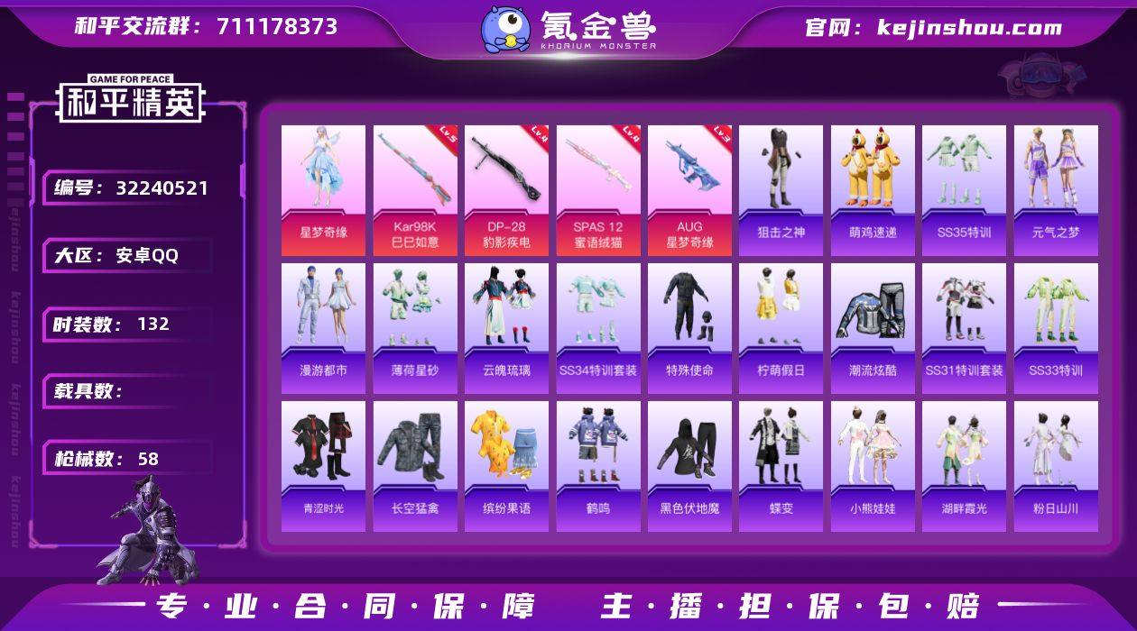 精氪地铁号/ 【三级星梦奇缘/星梦奇缘】地铁42点天赋 实名: 可修改 时装数: 132 枪械数: 58 战备数: 42 热门装扮: 星梦奇缘 稀有枪皮: SPAS-12蜜语绒猫,AUG星梦奇缘,Kar98K-巳巳如意,DP-28-豹影疾电
