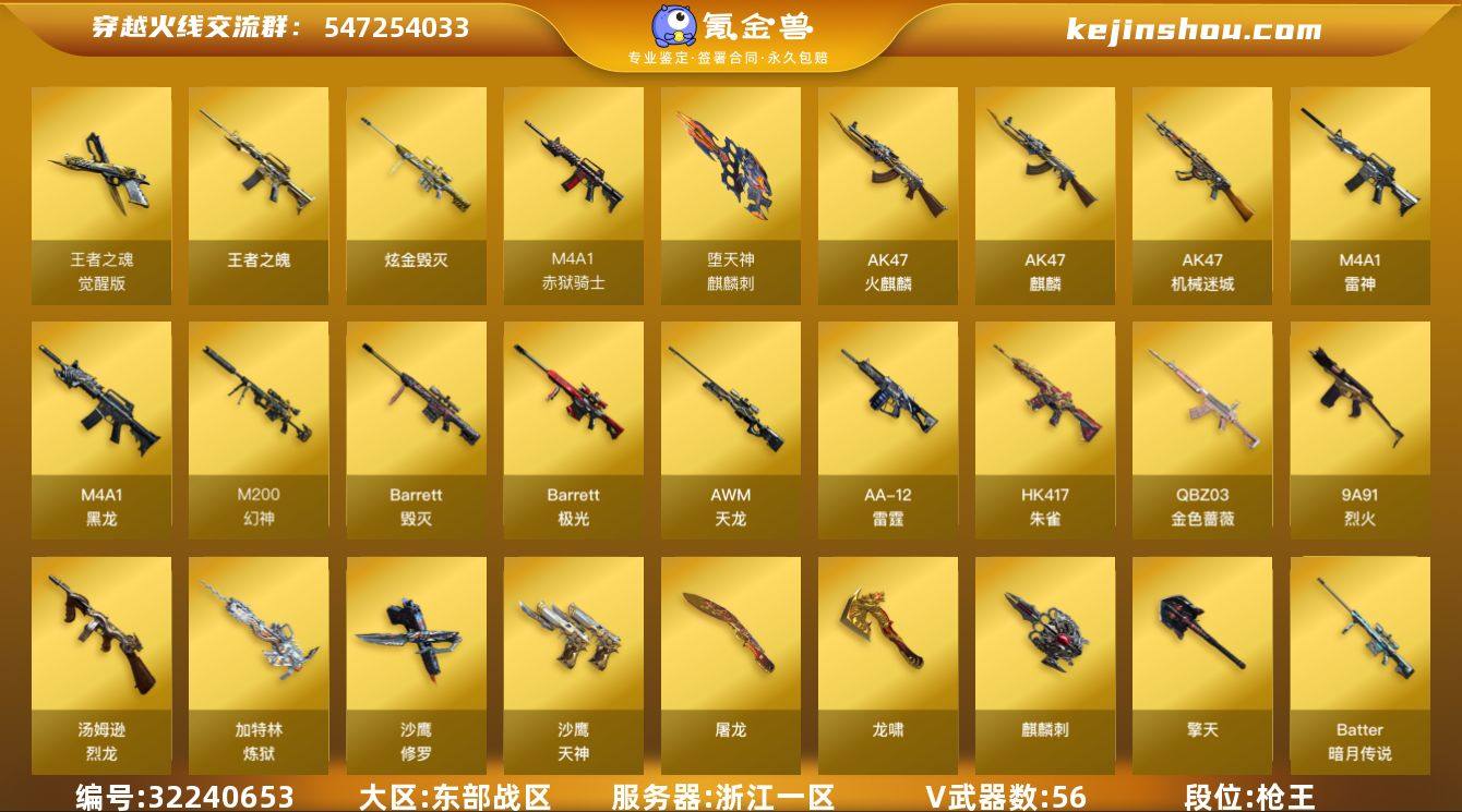 浙江一区-60V-2王者武器数-1炫金武器数 【热门武器】:QBZ03-金色蔷薇,HK417-朱雀,M200-幻神,死亡之眼,金色小号,C.A.T,汤姆逊-烈龙*6,加特林-炼狱,火麒麟-绝迹,沙鹰-修罗*4 【王者炫金武器】:王者之魄,炫金毁灭 【音效卡】:M200-幻神音效卡,M4A1-黑龙音效卡,Barrett-毁灭音效卡,Barrett-碧霄极光音效卡 【皮肤】:烈龙-星空,雷神-虎将*2,火麒麟-华夏之心,火麒麟-平天大圣,毁灭-星空,黑龙-暗月,M4A1-黑龙-361,战神-粉色甜心皮肤*3,战神-紫绶金章皮肤*9,战神-流金岁月皮肤*7,AK47-B-常胜将军-孙权,天龙-能量核心,极光-能量核心,修罗-能量核心 【角色】:零,瞳,零·纪元,战地猎狐,王者-瞳-闭月羞花,雪域霜狐,乔伊教练,修道士,芳心审判者,风暴女,嘉年华灵狐,娟娟,兰-新年限定,龙儿,潘多拉-甜心教官,潜龙队-X,斯沃特-X,蜀雪,铁骑-乘风破浪,王者-零-传说之路,新娜塔莎,影武者-X,海豹突击队 【人偶武器】:火麒麟-绝迹,迷你钢铁终结者,迷你救赎猎手,AWM-灵狐-15周年嘉年华,C.A.T,迷你深渊冰龙*3,夺魂,迷你生化手雷,生化手雷-机甲核心,闪光弹-小乔,迷你超能女侍 【暴走生化】:死亡之眼 【挑战大师】:激光毁灭者III-白马银枪,激光毁灭者III 【英雄级武器】:AK47-火麒麟,AK47-麒麟,M4A1-黑龙,M4A1-雷神*2,AK47-机械迷城,HK417-朱雀,QBZ03-金色蔷薇,9A91-烈火,烈火-动感闪耀,AK-47-猩红传说*3,AK47-B-战神*2,AWM-天龙*3,Barrett-毁灭,Barrett-极光,M200-幻神,Barrett-暗月传说,加特林-炼狱,汤姆逊-烈龙*6,AA-12-雷霆,沙鹰-修罗*4,沙鹰-天神*2,王者之魂-觉醒版,屠龙,龙啸,麒麟刺-堕天神,擎天,麒麟刺,幻灵之锋,屠龙-动感闪耀,斩神刀-雷暴,高爆手雷-雷暴,高爆手雷-堕天神,高爆手雷-幻灵,手雷-动感闪耀,闪光弹-雷暴,闪光弹-...