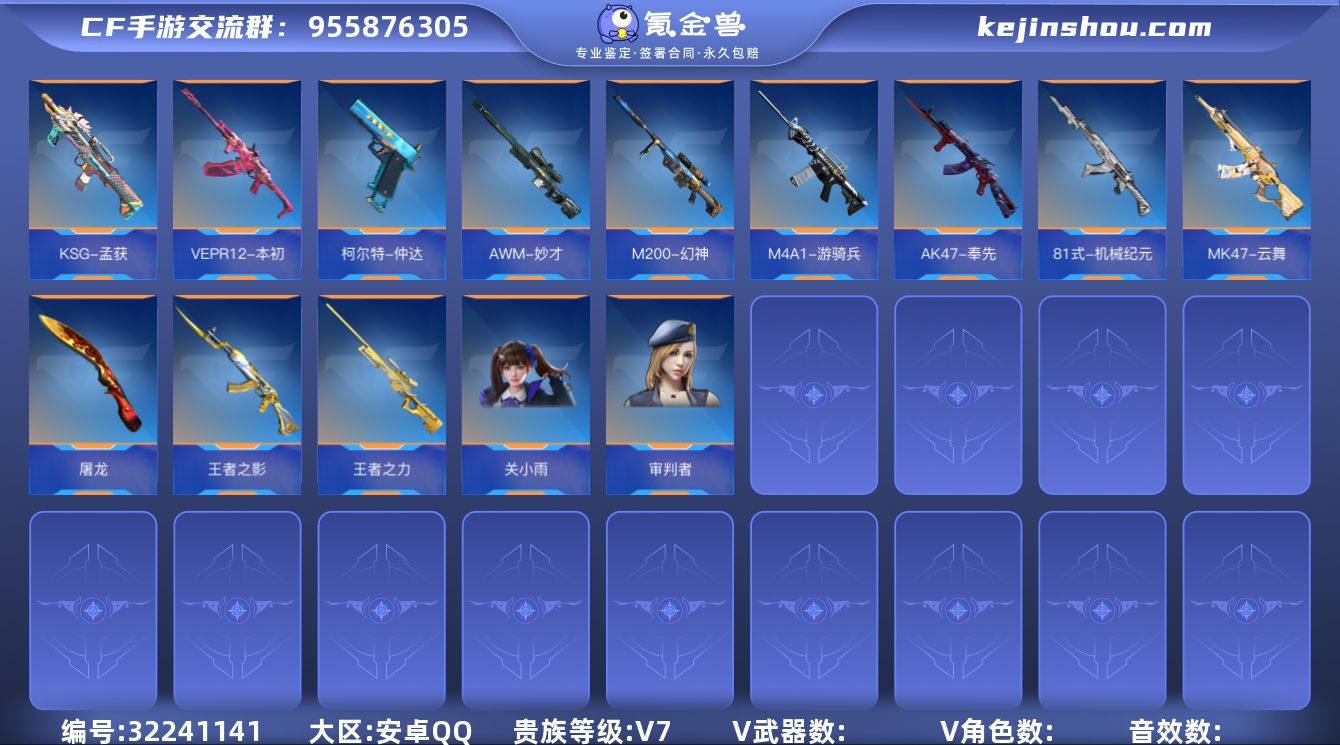安卓QQ,成人号:是,角色等级:154,实名:有修改人脸机会/实名是本人,段位:枪皇,VIP等级:V7,V武器数量:402,V角色数量:12,V总数量:296,王者武器数:22,万化数量:609, 【人物角色】孙悟空,牛妹,关小雨,瞳,樱,太阳神-曦,幽灵刀锋-觉醒,大老师,堕天使,葵,春节兰,圣诞灵狐,刀锋-2017,魅惑灵狐,幻影,夜玫瑰,斯沃特,秦师,祝融夫人,炽天使-X,武媚,杨玉凝,云悠悠-心动起点,龙妹,木兰,奥妹,蜀雪,月神,灵动武士,英雄兰-X,赛丝,职场灵狐,斯薇特, 【王者武器】王者之业,王者之竞手雷,王者之竞烟雾弹,王者之竞闪光弹,蝴蝶刀-天神,唐刀-华夏传说,M12S-雷霆王者,雷霆王者之锋,M4A1-雷霆王者,王者之势闪光弹,王者之心烟雾弹,王者之心闪光弹,王者之势烟雾弹,闪光弹-雷霆王者,烟雾弹-雷霆王者,高爆手雷-雷霆王者,王者之心,王者之影,王者之魂,王者之锋,王者之迹,王者之神, 【至尊套装】霆至尊,M4A1-雷霆王者至尊,M12S-雷霆王者至尊, 【带V枪械】AK47-无影-荣耀酷本,M4A1-赛博雷神,KSG-天蓬元帅-千变,M4A1-仲达,M4A1-变色龙,沙鹰-修罗-紫魇,M4A1-卧龙觉醒,M4A1-游骑兵,M4A1-死神,M4A1-黑龙,M4A1-黑骑士,M4A1-雷神,47-云舞,47-机械纪元,AK47-雷麒麟,AK47-燎天净火,AK47-沙漠郡主-超觉,AK47-奉先,双持柯尔特-极光-清凉夏日,AK47-无影-葵,AK47-Rush-星速,M4A1-雷神-荣耀蛮蛮,M4A1-游骑兵-紫魇,AK47-火麒麟,AK47-无影,81式-光明之神,HK416-混世行者,M4A1-黑龙-暗月,M14EBR-暗夜觉醒,AUG-机械纪元,SCAR-文远,剑齿虎-炫彩,98K-血月,98K-黑骑士,AK12-天启,M200-心动次元,M200-幻神,巴雷特-雷神,巴雷特-极光,MR1-龙吟惊沧海,AWM-妙才,AWM-裁决,AWM-游骑兵,AWM-天龙,09式狙-天神,RPK-美杜莎,加特林-蟒蛇,加特林-炼狱