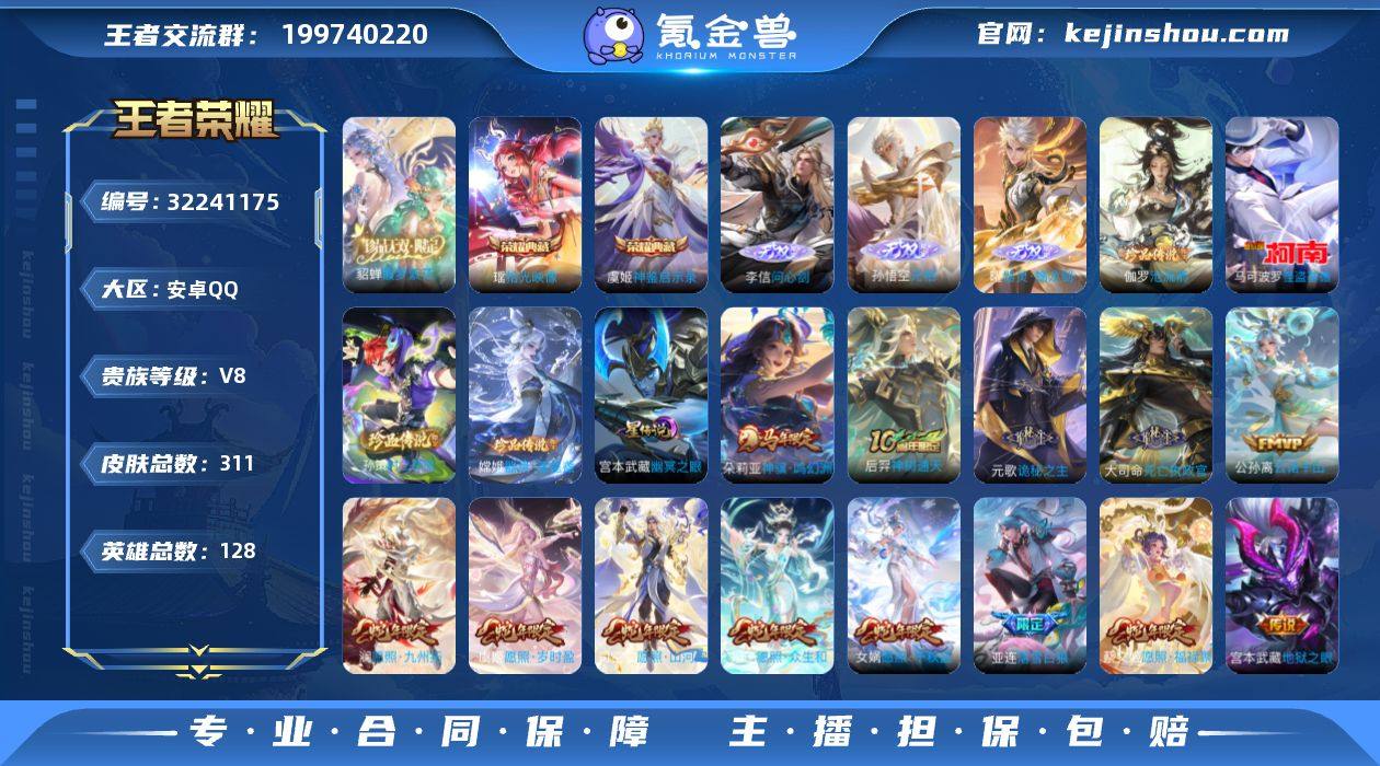【店铺主推·神鉴启示录·拾光映像·貂蝉馥梦繁花·问心剑·无相·器灵螭龙剑·沧流箭·器灵落星盏·孙策时之奇旅·怪盗基德·满蛇年限定·神骥鸣幻洲·诡秘之主·落雪白狼·遇见神鼓·浮生妄·小兵雪境奇遇】【可二次】YXw18418-安卓Q-128英雄-311皮肤-10王者印记-250铭文-贵族积分9w【贵族8】【2典藏·1珍品无双·3无双·4珍品·2星传说·29传说·1天幕·47按键】【因赛季更新游戏段付以上号为准!】 【英雄全皮】:元歌全皮,孙权全皮,亚连全皮,敖隐全皮,夏洛特全皮,司空震全皮,戈娅全皮,空空儿全皮,影全皮 【荣耀典藏】:虞姬神鉴启示录,瑶拾光映像 【珍品无双】:貂蝉馥梦繁花 【无双皮肤】:李信问心剑,孙悟空无相,曜器灵螭龙剑 【珍品传说】:伽罗沧流箭,嫦娥器灵落星盏,孙策时之奇旅,马可波罗怪盗基德 【小兵皮肤】:小兵雪境奇遇 【星元皮肤】:宫本武藏幽冥之眼,刘备时之思念 【天幕】:狸尾假日天幕 【传说皮肤】:朵莉亚神骥鸣幻洲,后羿神树通天,元歌诡秘之主,大司命死亡执政官,公孙离云诺千山,司空震愿照山河定,女娲愿照千秋盛,妲己愿照众生和,澜愿照九州拓,蔡文姬愿照福禄聚,虞姬愿照岁时盈,云缨幻光神枪,庄周牧神诗旅,海月金乌负日,亚连落雪白狼,鲁班七号时之奇旅,吕布遇见神鼓,夏洛特浮生妄,马超无双飞将,孙尚香异界灵契,铠绛天战甲,虞姬启明星使,孙悟空零号赤焰,曜云鹰飞将,刘备时之恋人,张良黄金白羊座,后羿黄金射手座,宫本武藏地狱之眼,孙悟空地狱火 【限定皮肤】:暃埋骨钱,蔡文姬夏日便利店,大乔绒语心约,虞姬夏日便利店,姜子牙天穹之誓,李白谪仙醉月,狄仁杰阴阳师,赵云皇家上将,墨子神迹守卫,孙尚香蔷薇恋人,孙尚香异界灵契,鲁班七号时之奇旅,吕布遇见神鼓,元歌云间偶戏,元歌无心,马可波罗暗影游猎,狄仁杰魔术师,狄仁杰万华元夜,达摩沙漠行僧,项羽海滩...