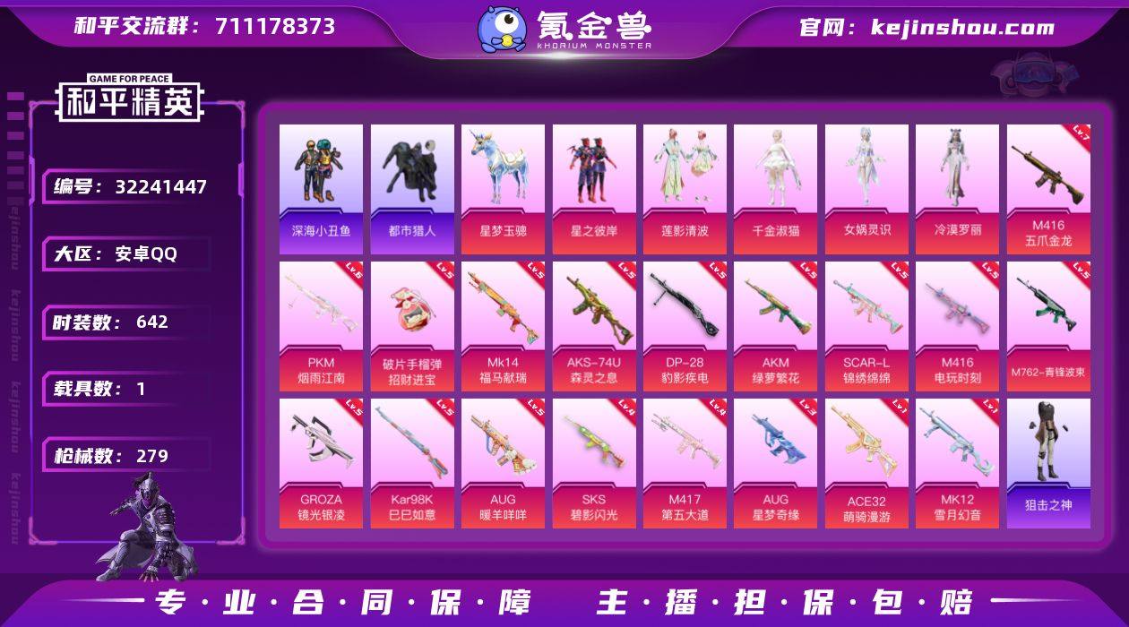【满天赋星梦奇缘-5粉18粉1载具】实名: 可修改 时装数: 642 载具数: 1 枪械数: 279 战备数: 169 热门装扮: 呆萌铁蟹,深海小丑鱼,鹰眼刺客,都市猎人,星之彼岸,莲影清波,千金淑猫,女娲灵识,冷漠罗丽 载具: 星梦玉骢 稀有枪皮: M416五爪金龙,SKS-碧影闪光,M417第五大道,AKM绿萝繁花,SCAR-L-锦绣绵绵,PKM江南烟雨,M416电玩时刻,AUG星梦奇缘,M762-青锋波束,GROZA-镜光银凌,Kar98K-巳巳如意,AUG-暖羊咩咩,MK12-雪月幻音,DP-28-豹影疾电,AKS-74U-森灵之息,破片手榴弹-招财进宝,ACE32-萌骑漫游