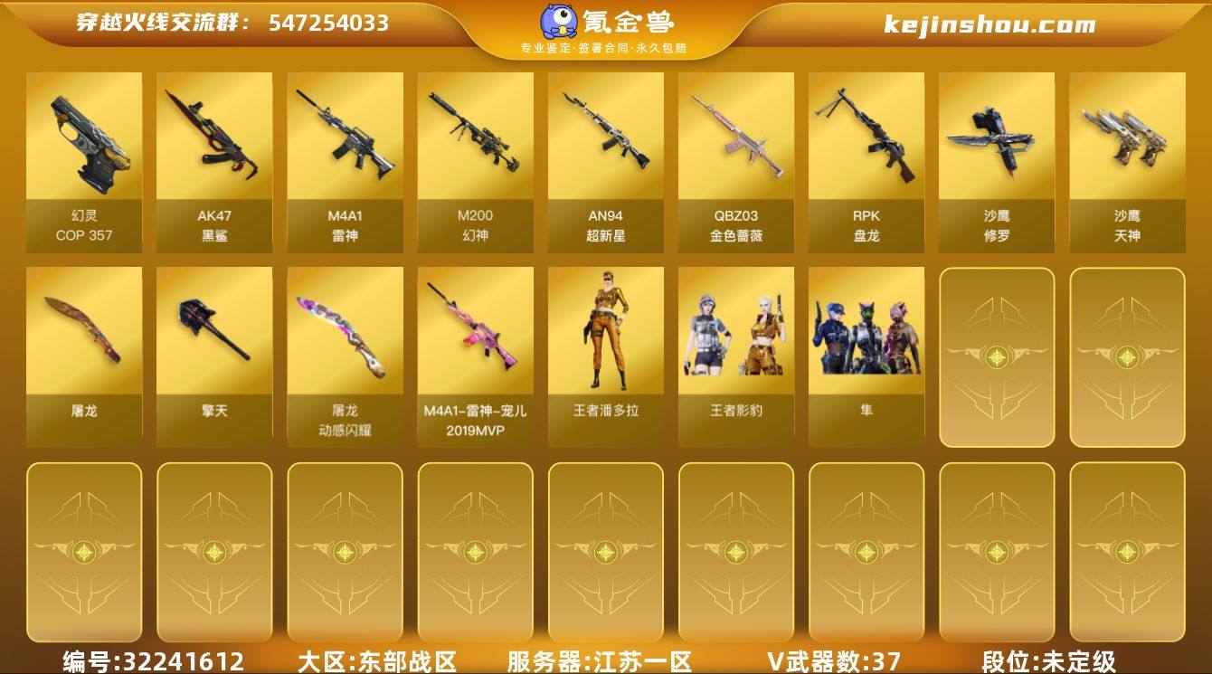 江苏一区-39V-4王者-0炫金 【热门武器】:QBZ03-金色蔷薇,M200-幻神,RPK-盘龙,COP 357-幻灵,沙鹰-修罗*3 【皮肤】:幻神-宠儿-2021MVP,M200-幻神-荣耀世冠白鲨,M200-幻神-N9-2022MVP,QBZ03-荣耀世冠白鲨,雷神-宠儿-2019MVP,轻型军用手斧-再燃火线,麒麟刺-荣耀世冠白鲨 【角色】:隼,王者影豹,王者潘多拉,暗夜-X,初恋灵狐,电竞少女,娟娟,潘多拉-X,兔囡囡 【英雄级武器】:M4A1-雷神*2,AN94-超新星,AK47-黑鲨,QBZ03-金色蔷薇,王者之武-觉醒版,M200-幻神,王者风神-觉醒版,RPK-盘龙,沙鹰-修罗*3,沙鹰-天神,COP 357-幻灵,屠龙,擎天,丛林匕首-玄豹,高爆手雷-幻灵*6,高爆手雷-玄豹*2,闪光弹-幻灵*5,闪光弹-玄豹*2,烟雾弹-幻灵*4,烟雾弹-玄豹*2 【道具】:BS战队炫彩背包,夺命之镰,防化服,金色流光-枪王排位,星辰流光-枪王排位,枪王排位28赛季金色流光,EP战队击杀图标,防弹头盔,防弹衣,C4工具钳,手雷包 【特殊枪械】:1盘龙
