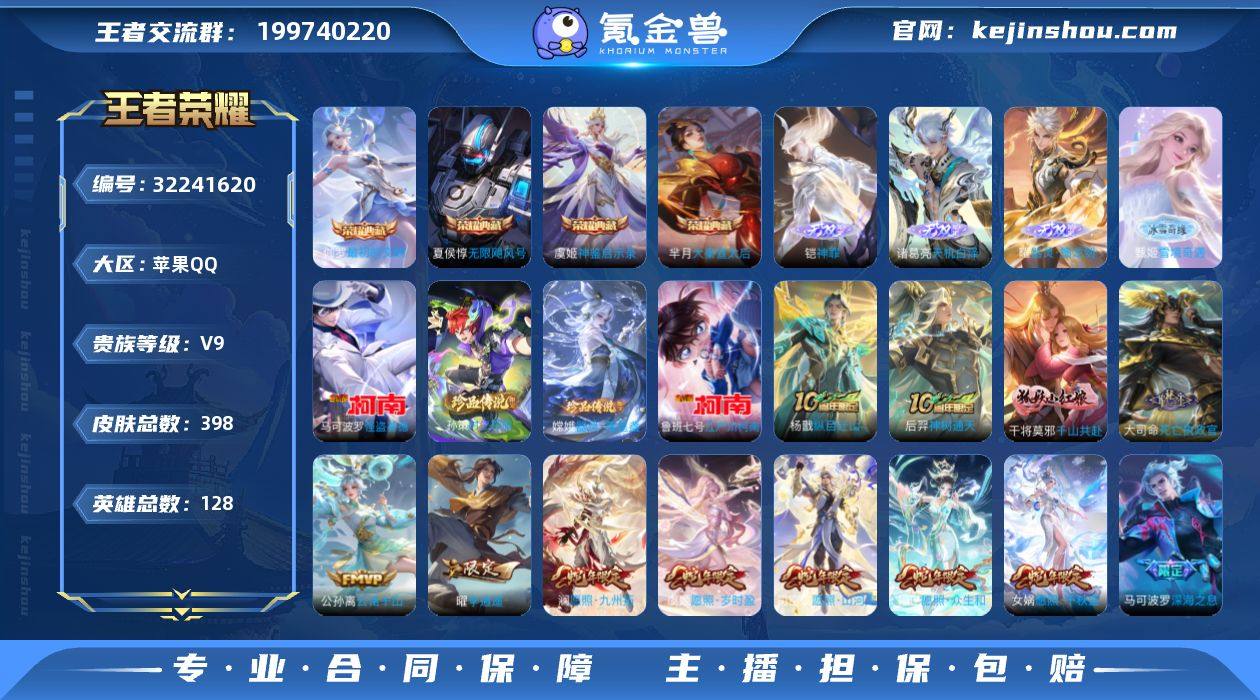 苹果Q-V9-至尊星耀III段位-128英雄-396皮肤-4典藏皮肤-4无双-4珍品传说-46传说-114史诗 【英雄全皮】:达摩全皮,孙权全皮,猪八戒全皮,空空儿全皮,影全皮,少司缘全皮 【荣耀典藏】:夏侯惇无限飓风号,芈月大秦宣太后,虞姬神鉴启示录,伽罗最初的交响 【无双皮肤】:甄姬雪境奇遇,曜器灵螭龙剑,诸葛亮天机白泽,铠神罪 【珍品传说】:马可波罗怪盗基德,鲁班七号江户川柯南,孙策时之奇旅,嫦娥器灵落星盏 【传说皮肤】:杨戬纵目迁山,后羿神树通天,干将莫邪千山共赴,大司命死亡执政官,公孙离云诺千山,西施续相思,司空震愿照山河定,女娲愿照千秋盛,妲己愿照众生和,澜愿照九州拓,蔡文姬愿照福禄聚,虞姬愿照岁时盈,云缨幻光神枪,嬴政玄雷天君,王昭君映山客,桑启鸣野蒿,夏侯惇霜北刀,朵莉亚心动手记,孙尚香乘龙问璇玑,狄仁杰夜礼服假面,王昭君永恒水手月亮,大乔时之奇旅,鲁班七号时之奇旅,上官婉儿妄想奇谈,马可波罗妄想实况,夏洛特浮生妄,干将莫邪画中仙,花木兰燃星之曲,李信山海炽霜斩,吕布怒海麟威,马可波罗深海之息,貂蝉遇见胡旋,赵云淬星耀世,王昭君乞巧织情,西施游龙清影,曜李逍遥 ,兰陵王默契交锋,虞姬启明星使,曜云鹰飞将,虞姬云霓雀翎,达摩黄金狮子座,花木兰冠军飞将,后羿黄金射手座,杨戬永曜之星,孙尚香末日机甲,狄仁杰超时空战士 【限定皮肤】:白起狰,夏侯惇霜北刀,蔡文姬夏日便利店,虞姬夏日便利店,李白谪仙醉月,狄仁杰阴阳师,虞姬凯尔特女王,赵云皇家上将,墨子神迹守卫,墨子降魔,妲己时之奇旅,孙尚香蔷薇恋人,鲁班七号时之奇旅,庄周蜃楼王,庄周高山流水,高渐离死亡摇滚,高渐离玩趣恶龙,钟无艳王者之锤,孙膑妖精王,扁鹊炼金王,芈月重明,芈月幻夜卜梦,吕布御风骁将,元歌云间偶戏,夏侯惇朔风刀,甄姬游园惊梦,曹操烛龙,典...