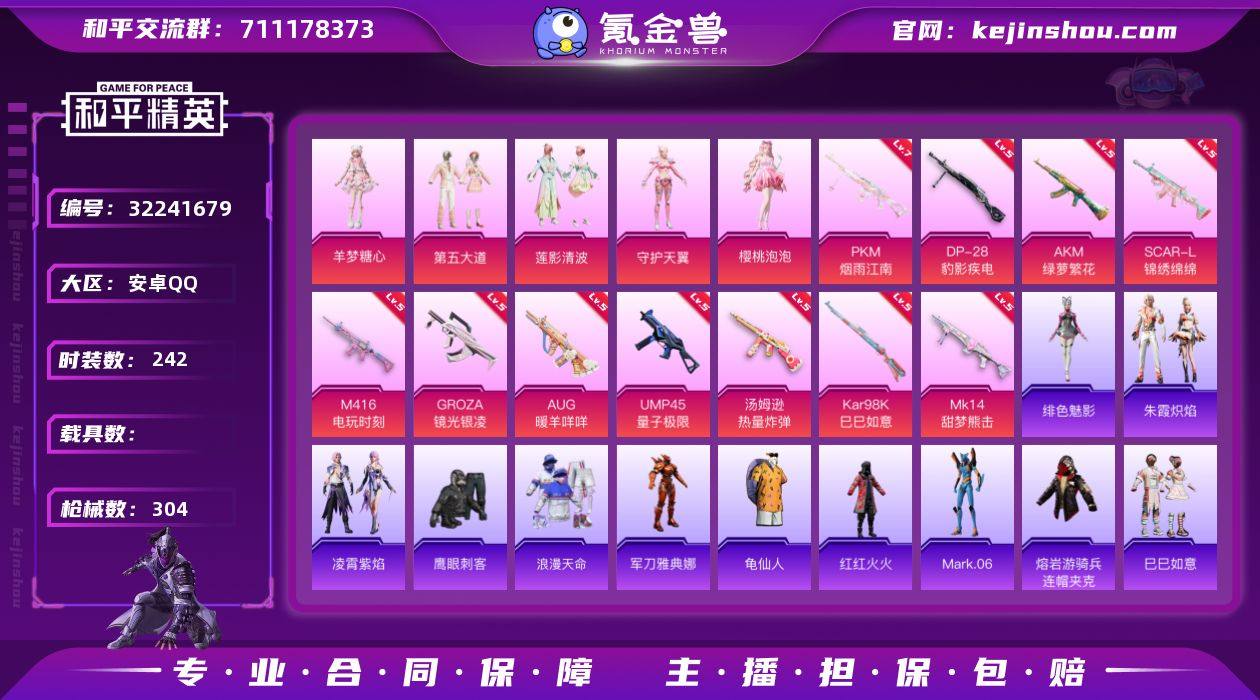 安卓 手Q-5粉装-6特效枪-3载具-2粉色飞行器-36647热力值-1王牌印记-74套装-96枪皮 【热门品类】:套装-潮萌小黄鸭 【粉色套装】:粉装-新星烈龙,粉装-极致幻想,粉装-俏皮狐尾,粉装-草莓生巧,角色-冰炎战车 【粉色枪皮等级】:SCAR-L-彩装战姬(六级),M762-激战未来(五级),Kar98K-伏魔团(四级),Kar98K-巳巳如意(一级),M24-莲影清波(一级),DP-28-圣堂之誓(一级) 【粉色载具】:宾利BATUR(极速紫),仰望U8(龙石绿),合金龙骨(蓝) 【粉色枪皮】:SCAR-L-彩装战姬,M762-激战未来,Kar98K-伏魔团,Kar98K-巳巳如意,M24-莲影清波,DP-28-圣堂之誓 【粉色飞行器】:伏魔团飞行器,繁龙极客飞行器 【粉色降落伞】:伏魔团降落伞,夏日绵绵冰降落伞,香水柠檬降落伞,暗夜玫瑰降落伞,萌物绒绒降落伞,莲影清波降落伞,圣堂之誓降落伞 【稀有枪皮】:AKM-冰凉西瓜,AKM-夜灯,AKM-阿狸红,M16A4-魔法学院,SCAR-L-炫彩节奏,M416-糯团青竹,M416-罗小黑,GROZA-治愈之星,GROZA-马卡龙,GROZA-黑色刀锋,AUG-炫光贝贝,QBZ-九霄,QBZ-原初圣火,QBZ-彩虹符号,M762-拳皇97,M762-镭射皇者,Mk47-洛神天依,AC-VAL-天降萌叽,AC-VAL-快闪甜心,蜜獾-绯穹魔姬,UZI-啾咪啾咪,UZI-魔法学院,Vector-彩虹符号,Vector-治愈之星,汤姆逊-奇异狩猎者,P90-快闪甜心,Kar98K-彩虹符号,Kar98K-红色方程式,M24-治愈之星,M24-香水柠檬,AWM-圣堂之誓,SKS-怪兽之王,VSS-华贵君王,VSS-镭射皇者,VSS-黑色刀锋,Mini14-原初圣火,Mini14-炫彩节奏,Mini14-熔岩统帅,Mini14-阿狸红,Mini14-马卡龙,Mk14-山经魅狐,Mk14-治愈之星,MK20-H-快闪甜心,M200-祥瑞锦鲤,S1897-星之信仰,S1897-镭射皇者,DBS-圣堂之誓,M249-古堡领主,M249-彩虹符号,M249-拳皇97,M249-镭射皇者,DP-28-原初圣火,MG3-幻世战舞者,P9...