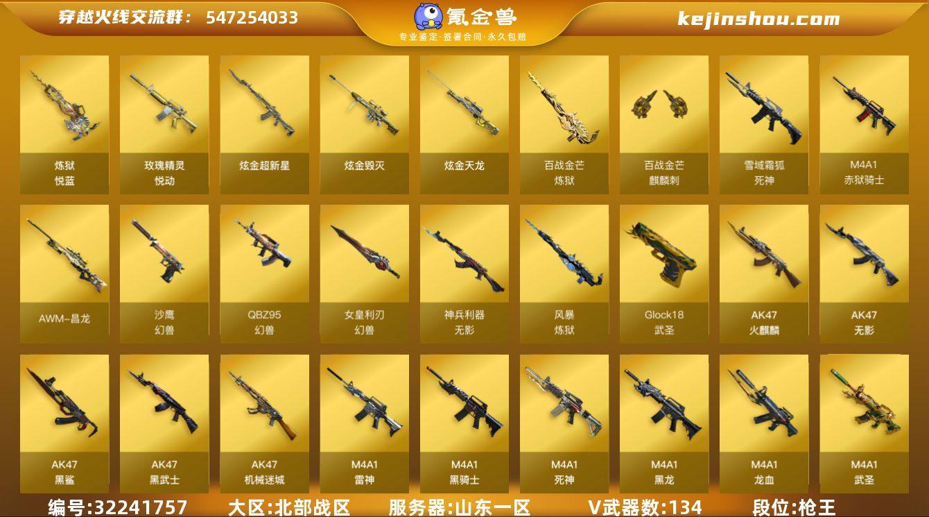 【ky4157】山东一区-141V-9王者-4炫金 【热门武器】:QBZ03-金色蔷薇,M200-竞技荣光,死亡之眼*2,白虎-电玩蓝兔,Kar98K-星神,M4A1-黑骑士*6,汤姆逊-烈龙*6,RPK-盘龙*5,USP-雷暴,沙鹰-修罗*2,炽芒蝶刃,高爆手雷-幻兽*5 【王者炫金武器】:玫瑰精灵-悦动*4,炼狱-悦蓝,炫金超新星,炫金毁灭*2,炫金天龙 【音效卡】:Barrett-碧霄极光音效卡,炼狱-百战金芒-庆典舞曲音效卡,沙鹰-修罗-盛典舞曲音效卡,死神-雪域霜狐-怀旧音效卡,AWM-昌龙-怀旧音效卡,AK47-火麒麟-怀旧音效卡 【皮肤】:裁决-运输船 皮肤,雷神-暗月,雷神-能量核心,雷神-机甲刑天皮肤,雷神-维纳斯皮肤,雷神-诺拉 皮肤,M4A1-再燃火线,雷神-神秘按键 皮肤,火麒麟-雷神,火麒麟-心动糖果,毁灭-暗月,毁灭-风暴,毁灭-秦师 皮肤,M4A1-千变-孔明皮肤,黑龙-暗月,黑骑士-暗月*3,M4A1-黑骑士-娜塔莉娅 皮肤,无影-暗月,无影-能量核心*2,天启-暗月,战神-紫绶金章皮肤,战神-流金岁月皮肤*2,AK47-B-常胜将军-孙权,天神-暗月,屠龙-惊鸿 皮肤,轻型军用手斧-再燃火线,麒麟刺-月皮肤 【角色】:葵,樱,蝴蝶,鹰,战地猎狐,王者之瞳,堕落女神,雪域霜狐,奇洋探员,乔伊教练,修道士,暗夜-X,北极狐-X,初恋灵狐,虎妞,嘉年华灵狐,娟娟,兰妹妹,灵狐者-X,灵狐者-七夕宝贝,龙儿-小淘气,麻雀,潘多拉-X,潘多拉-甜心教官,青霞仙子,斯沃特-X,蜀雪,雪莉杨,雪莉杨-摸金校尉,樱-战斗天使,影武者-X 【人偶武器】:AWM-灵狐-15周年嘉年华*2,M37-葵,M4A1-刀锋,迷你深渊冰龙*2,迷你裂空之翼*2,迷你牛魔王,迷你波特博士*3,夺魂,迷你牛牛*2,迷你火种,生化手雷-机甲核心*2,深渊终结者手雷*2,闪光弹-小乔,迷你艾比,迷你超能女侍,迷你巨石泰坦-魔花研究所 【暴走生化】:死亡之眼*2,超级对讲机 【挑战大师】:...