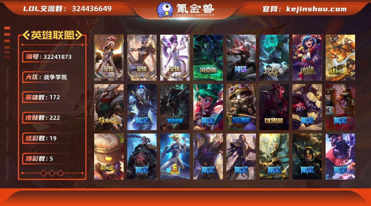 【LOLZ1318】172英雄/222皮肤/7神话/25限定/5臻彩/19炫彩/9传说/74史诗/白银/10周年 安妮/源代码 乐芙兰/殿堂传奇 薇恩/摄魂 薇恩/至臻 K/DA 阿卡丽/至臻 K/DA ALL OUT卡莎/至臻 玉剑传说 武剑仙/冰霜之刃 艾瑞莉娅 炫金/星之守护者 卡莎 热情之光/魔女 阿卡丽 虚荣/净雪之月 莫甘娜 冬虹/龙年 孙悟空/美猴王 孙悟空/司马懿 仲达/点心宝贝 阿木木/“主人不要我了” 阿木木/英勇玩具兵船长/圣诞老人 酒桶/战熊骑士 瑟庄妮/S1FNC 迦娜/S1FNC 嘉文四世/S2 暗杀星 蒙多/S4 SSW 炼金/S4 SSW 雷恩加尔/S5 SKT T1 雷克顿/6周年 伊泽瑞尔/胜利之剑 亚托克斯/胜利枪神 卢锡安/南瓜头 费德提克/密林猎手 提莫/暗影 沃里克/波比的巧克力工坊/都铎王朝 图奇/御星魔矢 艾希/红桃杰克 崔斯特/防暴士兵 辛吉德/铁哥们儿 奥拉夫/战地机甲 厄加特/女皇 艾希/绅士 科加斯/电玩女神 娑娜/冰霜之刃 艾瑞莉娅/上古战魂 魔腾/炼狱魔犬 内瑟斯/泳池派对 吉格斯/腥红之月 崔斯特/特战先锋 赵信/翼骑统领 赵信/摄魂男爵 弗拉基米尔/天人合一 易/战场公主 希维尔/钢铁之心 希维尔/圣洁化身 索拉卡/源代码 索拉卡/熊猫 提莫/火箭达人 崔丝塔娜/荒野豺狼 沃里克/黑帮狂花 厄运小姐/紫晶射手 艾希/国王 泰达米尔/黑色荆棘 莫甘娜/炼金狂士 辛吉德/死神 卡尔萨斯/卡尔萨斯·祸害之光/战争血统 蒙多/掠星魔刃 卡萨丁/恐惧新星 普朗克/穿着正装的恶魔 维迦/抵抗军天使 凯特琳/黑曜石守护者 墨菲特/霸天巨兽 墨菲特/暗夜猫女 卡特琳娜/前线指挥官 卡特琳娜/暗星 嘉文四世/死亡绽放 伊莉丝/灵骨工匠 奥莉安娜/冰晶之核 布兰德/灵魂烈焰 布兰德/法老王朝 内瑟斯/四神之力 乌迪尔/血色之锤 波比/飞车暴走族 古拉加斯/大夏武士 潘森/刺客信条 凯南/铁甲雄心 盖伦/源计划:山 蕾欧娜/至高君王 玛尔扎哈/腥红之月 泰隆/帝王斑蝶 克格莫/腥红之月 鬼武者 慎/战...