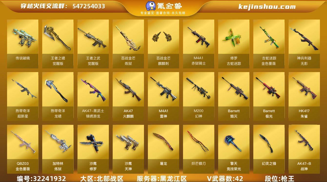 【ky3840】黑龙江区-44V-6王者-0炫金 【传说武器】:传说破晓 【热门武器】:传说破晓,QBZ03-金色蔷薇,HK417-朱雀,M200-幻神,金色蔷薇-古蛇迷踪,修罗-古蛇迷踪,加特林-炼狱,沙鹰-修罗*2,炽芒蝶刃 【音效卡】:天神-动感闪耀 音效卡,M200-幻神音效卡,Barrett-碧霄极光音效卡,炼狱-百战金芒-庆典舞曲音效卡 【皮肤】:幻神-CFS2022,幻神-动感闪耀 皮肤,幻神-电竞之星 皮肤,雷神-荣耀之魄,雷神-维纳斯皮肤,雷神-动感闪耀 皮肤,雷神-源计划2.0专属 皮肤,M4A1-再燃火线,火麒麟-轻羽皮肤,火麒麟-心动糖果,黑龙-暗月,战神-粉色甜心皮肤,AK47-B-常胜将军-刘备,屠龙-星火燎原,轻型军用手斧-再燃火线 【角色】:王者樱-热浪之夏,王者炫,蛇隐宗,奇洋探员,乔伊教练,暗夜-X,初恋灵狐,芳心审判者,嘉年华灵狐,灵狐者-X,灵狐者-黄金海岸,龙儿,麻雀,曼陀罗-X,潘多拉-X,潜龙队-X,蛇姬,斯沃特-X,维纳斯,游珑儿 【人偶武器】:M4A1-雷神-精英刀锋,海滩汪汪-巴雷特,迷你牛牛,深渊终结者手雷,迷你超能女侍 【挑战大师】:AK47-冰龙粉碎者,神圣爆裂者-末日III 【英雄级武器】:AK47-火麒麟,M4A1-雷神*2,HK417-朱雀,无影-神兵利器,黑武士-锦绣游龙,超新星-热带奇洋,金色蔷薇-古蛇迷踪,QBZ03-金色蔷薇,烈火-动感闪耀,王者之武-觉醒版,AK47-B-战神,Barrett-毁灭,Barrett-极光,M200-幻神,加特林-炼狱,炼狱-百战金芒,沙鹰-修罗*2,沙鹰-天神,天神-动感闪耀,修罗-古蛇迷踪,屠龙,幻灵之锋*2,擎天-竞技荣光,炽芒蝶刃,屠龙-动感闪耀,龙啸-热带奇洋,麒麟刺-百战金芒,王者之啸-觉醒版,高爆手雷-幻灵,高爆手雷-竞技荣光,手雷-动感闪耀,高爆手雷-云龙,手雷-热带奇洋,高爆手雷-古蛇迷踪,闪光弹-幻灵,闪光弹-竞技荣光*3,闪光弹-雷霆王者-觉醒版,烟雾弹-幻灵,烟雾...