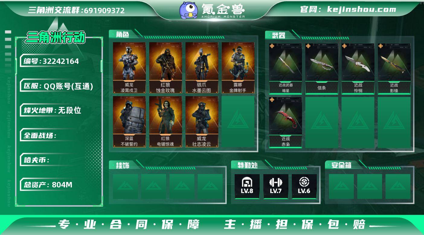 804m总资产【干员外观】:红狼蚀金玫瑰,电锯惊魂,威龙凌霄戍卫,威龙壮志凌云,深蓝不破誓约,骇爪水墨云图,露娜金牌射手【近战皮肤】:赤枭,怜悯,信条,影锋,暗星