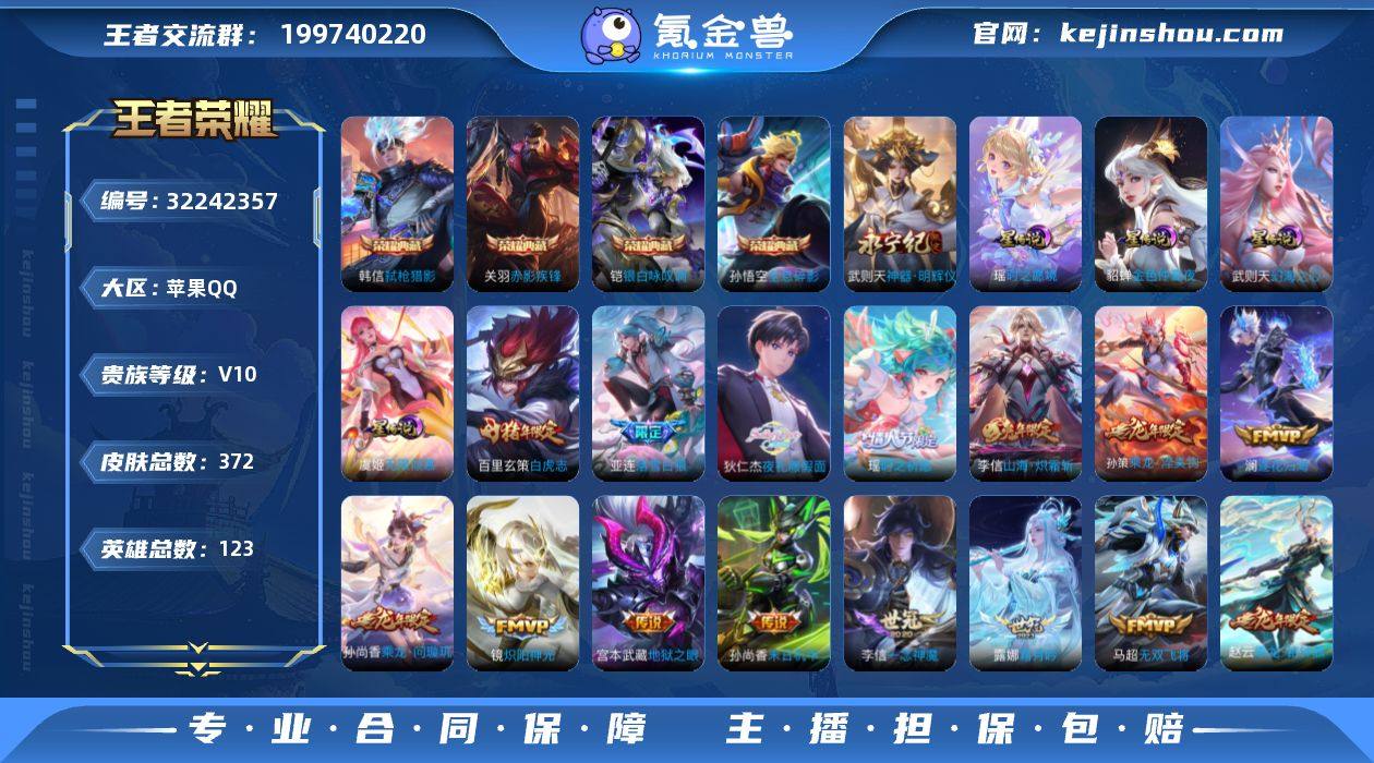 苹果Q-V10-至尊星耀III段位-123英雄-372皮肤-4典藏皮肤-1典藏英雄-1无双-47传说-100史诗【荣耀典藏】:武则天英雄,孙悟空全息碎影,关羽赤影疾锋,铠银白咏叹调,韩信弑枪猎影【无双皮肤】:武则天神器明辉仪【传说皮肤】:亚连落雪白狼,吕布曦玄引,貂蝉曦玄引,典韦战鼓燎原,孙尚香乘龙问璇玑,孙策乘龙淬吴钩,赵云乘龙铭钟鼎,澜逐花归海,艾琳觅芳踪,露娜霜月吟,孙膑小动物乐团,狄仁杰夜礼服假面,王昭君永恒水手月亮,宫本武藏惊梅引,东皇太一灼幽烈阳,澜电玩雷克斯,虞姬无限倾心,小乔山海琳琅生,李信山海炽霜斩,吕布怒海麟威,李白诗剑行,橘右京枫霜尽,马超无双飞将,露娜启示之音,蔡文姬花朝如约,女娲补天,瑶时之祈愿,赵云淬星耀世,王昭君乞巧织情,西施游龙清影,李元芳飞鸢探春,镜炽阳神光,虞姬启明星使,曜云鹰飞将,李信一念神魔,貂蝉猫影幻舞,干将莫邪久胜战神,虞姬云霓雀翎,百里玄策白虎志,梦奇胖达荣荣,后羿黄金射手座,诸葛亮武陵仙君,貂蝉仲夏夜之梦,孙尚香末日机甲,宫本武藏地狱之眼,武则天海洋之心,狄仁杰超时空战士 无限倾慕 时之愿境 幻海之心 金色仲夏夜【限定皮肤】:白起狰,狄仁杰阴阳师,小乔纯白花嫁,虞姬凯尔特女王,小乔山海琳琅生,赵云皇家上将,赵云百木心枪,墨子神迹守卫,墨子降魔,妲己热情桑巴,嬴政白昼王子,鲁班七号狮舞东方,庄周高山流水,高渐离玩趣恶龙,钟无艳超时空战士,孙膑寅虎展翼,扁鹊炼金王,芈月重明,芈月白晶晶,芈月幻夜卜梦,吕布猎兽之王,元歌无心,夏侯惇朔风刀,甄姬游园惊梦,甄姬落雪兰心,曹操烛龙,典韦穷奇,典韦蓝屏警告,狄仁杰魔术师,狄仁杰万华元夜,达摩沙漠行僧,项羽海滩派对,老夫子醍醐杖,关羽冰锋战神,程咬金演武夺筹,露娜启示之音,韩信傲雪梅枪,王昭君午后时光,兰陵王金庭之子,橘右京枫...