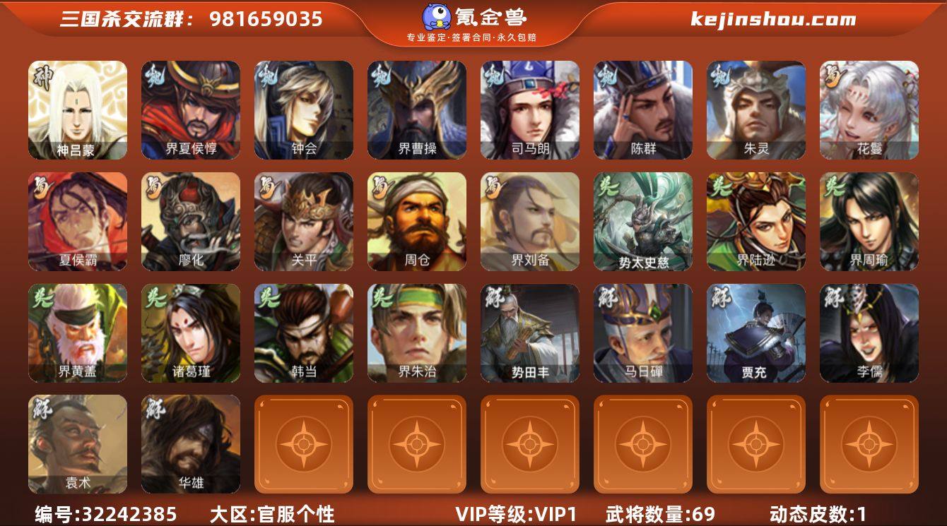 【3281】官阶:先锋将军;VIP等级:VIP1;史诗武将数量:2;动态皮肤数量:1;武将总数:69;史诗宝珠数量:0;将魂数量:4992;神将:0;魏国史诗武将:0;蜀国史诗武将:1;吴国史诗武将:1;群史诗武将:0 花鬘,势太史慈,神吕蒙,朱灵,钟会,界曹操,界夏侯惇,陈群,司马朗,夏侯霸,廖化,关平,界刘备,周仓,诸葛瑾,韩当,界黄盖,界周瑜,界陆逊,界朱治,李儒,华雄,袁术,马日磾,贾充,势田丰,孙寒华-蛇年限定(动态),陶谦-安民护祚(动态)