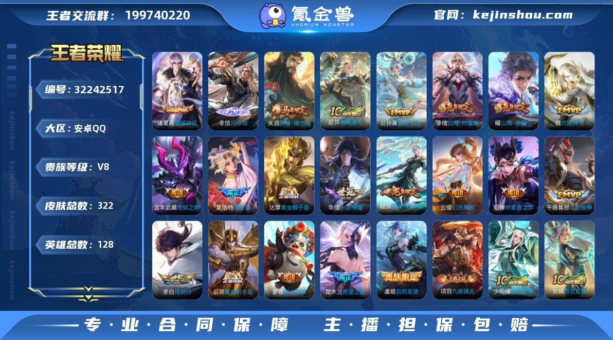 【王者荣耀】珍品无双0 典藏1 无双1 珍品传说0 传说24 史诗81 英雄128 皮肤322 贵族8级 荣耀典藏:星域神启__无双皮肤:问心剑__传说皮肤:炽阳神光|启明星使|胖达荣荣|地狱之眼|仲夏夜之梦|久胜战神|黄金狮子座|狄仁杰-超时空战士|黄金射手座|一念神魔|浮生妄|孙尚香-末日机甲|马超-琥珀纪元|燃星之曲|诗剑行|战鼓燎原|逐花归海|乘龙·铭钟鼎|山海·苍雷引|山海·炽霜斩|幻光神枪|云诺千山|神树通天|神骥·镇沧海__稀有限定:至尊宝|引擎之心|飞衡|神威|李小龙|梁祝|山海·玄木吟|时之彼端|狮舞东方|拒霜思|暗影游猎|百解令|冰霜恋舞曲|繁星吟游|古海寻踪|海滩派对|海盐诗旅|皇家上将|混沌棋|剑破天穹|江河有灵|黎明之约|魔术师|千军破阵|擒涛扼浪|穷奇|驱傩正仪|荣光圣徽|沙漠行僧|朔风刀|死亡摇滚|探海日志|饕餮|醍醐杖|天穹祈灯|玩趣恶龙|万华元夜|妄想食味|无心|纤云弄巧|星界游侠|驯魔猎人|演武夺筹|疑决卦|阴阳师|优雅恋人|遇见飞天|御旌|御銮|御狮|原初追逐者|云间偶戏|逐梦之影|暗隐猎兽者|暗渊魔法|冰雪圆舞曲|苍穹之光|乘风破浪|大乔-猫狗日记|德古拉伯爵|地狱岩魂|电玩小子|浮梦罗烟|伽罗-琥珀纪元|功夫厨神|鬼剑武藏|黄金分割率|节奏热浪|金属风暴|吕布-末日机甲|魅力维加斯|魅语|梦奇-顽趣|女仆咖啡|偶像歌手|奇遇舞章|赏金猎手|绅士熊喵|圣诞狂欢|水果甜心|水晶猎龙者|晚萤|赵云-未来纪元|星夜王子|摇滚巨星|鹰眼统帅|幽灵船长|逐浪之夏|紫霞仙子|谪仙醉月|噬灭天穹|敬我三分|天穹之誓|怒海争锋|修罗|曙光守护者|千年之狐|无限星赏官|特工魅影|星界战将|御霄|烛龙|原初探秘者|重明|云中旅人|钟馗-神迹守卫|暖冬·兔眠|死神来了|龙之律动|布丁狗之约|虚灵犬护|石田雨龙|逆浪荇歌|光弋星穹|往忆晖光|荣光之誓|万灵启世|巫礼祀神|鹤鸣心笺|九幽镇关|小乔-线条小狗|周瑜-线条小狗__优质皮肤:尼罗河女神|创世神祝|...