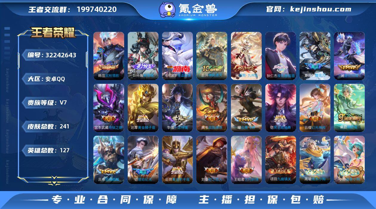 安卓Q-V7-最强王者段位-127英雄-241皮肤-1典藏皮肤-1无双-1珍品传说-20传说-70史诗【英雄全皮】:孙权全皮,敖隐全皮,空空儿全皮,影全皮【荣耀典藏】:韩信弑枪猎影【无双皮肤】:公孙离离恨烟【珍品传说】:马可波罗怪盗基德【传说皮肤】:韩信踏浪归,云缨神骥越千峰,后羿神树通天,澜愿照九州拓,云缨幻光神枪,桑启鸣野蒿,夏侯惇霜北刀,铠冥王哈迪斯,典韦战鼓燎原,铠琥珀纪元,澜逐花归海,狄仁杰夜礼服假面,吕布怒海麟威,王昭君乞巧织情,曜云鹰飞将,李信一念神魔,刘备时之恋人,达摩黄金狮子座,后羿黄金射手座,宫本武藏地狱之眼【限定皮肤】:公孙离离恨烟,夏侯惇霜北刀,铠冥王哈迪斯,蔡文姬夏日便利店,虞姬夏日便利店,姜子牙天穹之誓,狄仁杰阴阳师,赵云皇家上将,元歌无心,狄仁杰魔术师,项羽海滩派对,孙悟空至尊宝,李元芳银河之约,李元芳云中旅人,鬼谷子五谷丰年,百里玄策原初追逐者,裴擒虎李小龙,裴擒虎擒涛扼浪,鲁班大师探海日志,桑启海盐诗旅,艾琳流音漫舞,司空震地狱燃心,阿古朵江河有灵,张良古海寻踪,狄仁杰夜礼服假面,蒙恬荣光圣徽,鬼谷子天穹祈灯,铠琥珀纪元,沈梦溪龙舞盛年,鲁班七号蔬乡物语,李元芳蔬乡物语,刘邦剑破天穹,程咬金群星魔术团,周瑜熔金海岸【年限皮肤】:澜愿照九州拓【赛季限定】:李元芳云中旅人,桑启海盐诗旅,裴擒虎擒涛扼浪,鲁班大师探海日志,张良古海寻踪,鬼谷子天穹祈灯,刘邦剑破天穹,姜子牙天穹之誓,东皇太一噬灭天穹,太乙真人谧流熔炉,钟馗虚灵犬护,甄姬逆浪荇歌,亚瑟荣光之誓,百里玄策原初追逐者,蒙恬荣光圣徽,牛魔星界战将,项羽九幽镇关【战令限定】:李元芳银河之约,司空震地狱燃心,艾琳流音漫舞,鲁班七号蔬乡物语,李元芳蔬乡物语,蔡文姬夏日便利店,虞姬夏日便利店,亚连破空之剑,孙悟空神迹守卫,...
