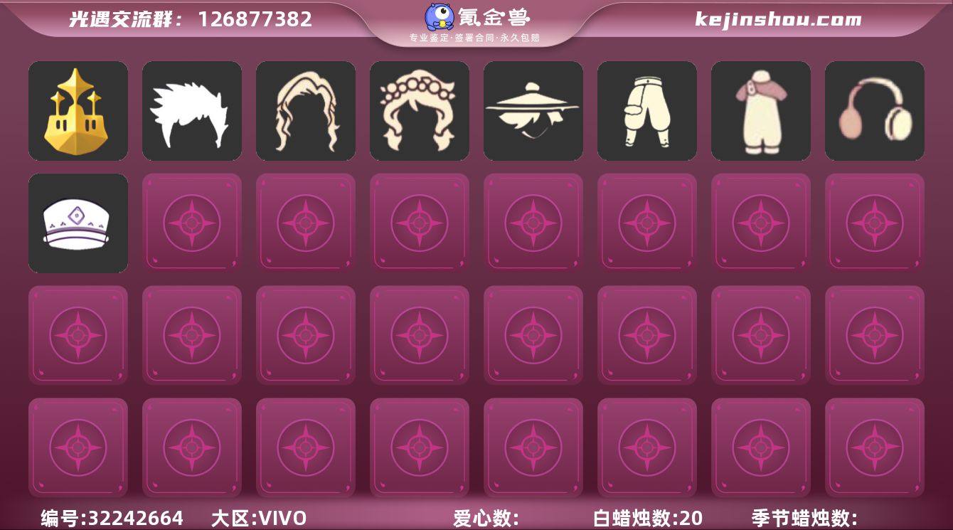 是否无翼号:否 爱心数量:4 白蜡烛数量:101 季节蜡烛数量:20 翼数量:129 二重奏季,彩染季 晨岛,霞谷 小黄鸭发饰礼包,必胜客联动分享披萨背饰礼包,必胜客联动装扮礼包,献瑞折扇礼包,周年影院套餐礼包,小狗周年发饰,向日葵连衣裙,姆明饰品套装,巫师,围巾,鹿角,蜘蛛斗,牛仔裤,兔子鞋,运动鞋,橘子,兔子,鲤鱼,水母,向日葵套,新年耳钉 必胜客联动斗篷,彩染围巾斗篷,彩染跳跃舞者斗篷,彩染季锐角边斗篷,遥鲲长斗,姆明季·斗篷,史力奇斗篷,二级毕业礼斗篷,渔夫斗篷,白金,绿芽,圣诞斗,万圣斗,马蹄莲斗 郡主发型,斜刘海发型,丸子头发型,脏辫发型,总裁发型,长发脏辫,女生短发,渔夫马尾圆帽,半边脏辫绑发,虚荣,花环,猫耳,丸子盘发 蛇年面具,矮人面具,黑脸,龙头 必胜客联动面饰,蔚蓝眼镜 寻宝铲,相框,相机,吊灯,姆明抱枕,姆明全家福,原木单人床,单人沙发木,原木双人沙,筑巢季钥匙,火盆,帐篷,气球,坐垫,爱心抱枕,火炬,遥鲲泳圈,向日葵,三角钢琴,彩色三角钢琴,大提琴,深色地毯,钢琴挂画,二重奏挂画 唐僧帽,渔夫帽,玉桂狗茶壶 必胜客联动围巾,史力奇围巾,姆明季围巾,二重奏季项链,围巾 彩染挑衅艺伎鞋子,彩染跳跃舞者鞋子,肯德基联动皮鞋,长筒凉鞋,姆明季·鞋子
